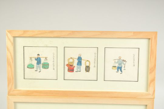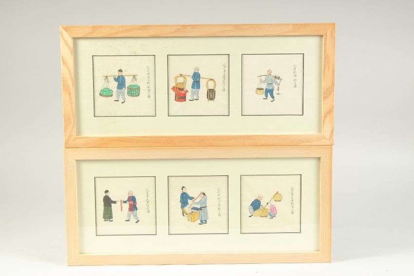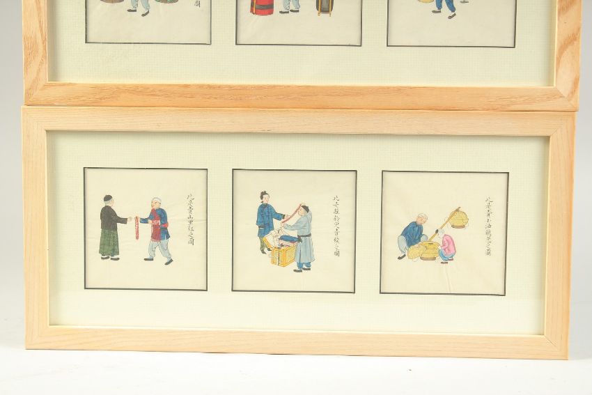 TWO SETS OF FRAMED EARLY 19TH CENTURY CHINESE PAINTINGS, each frame containing three individual paintings of figures in various pursuits, each 10.5cm square.