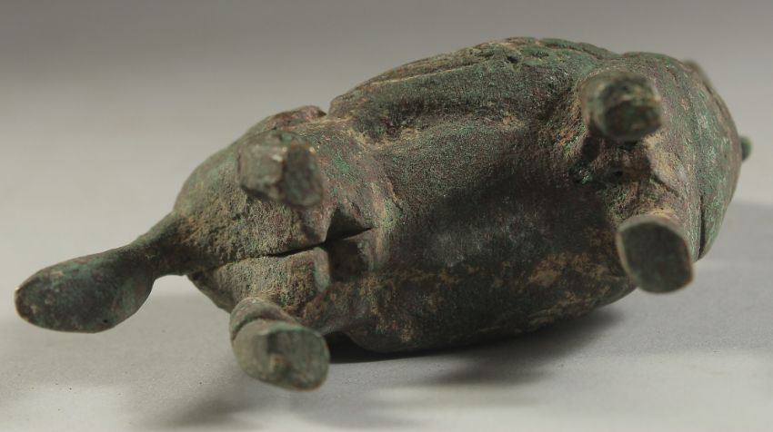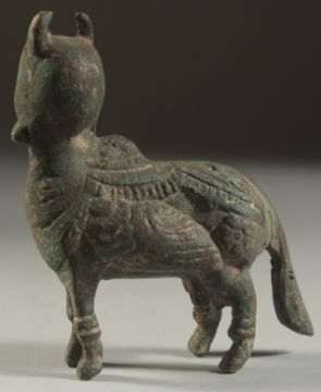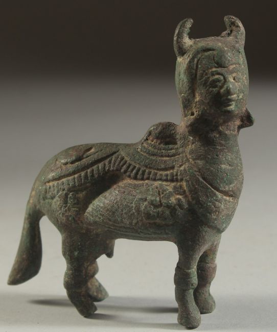 AN UNUSUAL MUGHAL INDIAN BRONZE FIGURE OF A KAMDHENU COW, 9cm long.