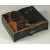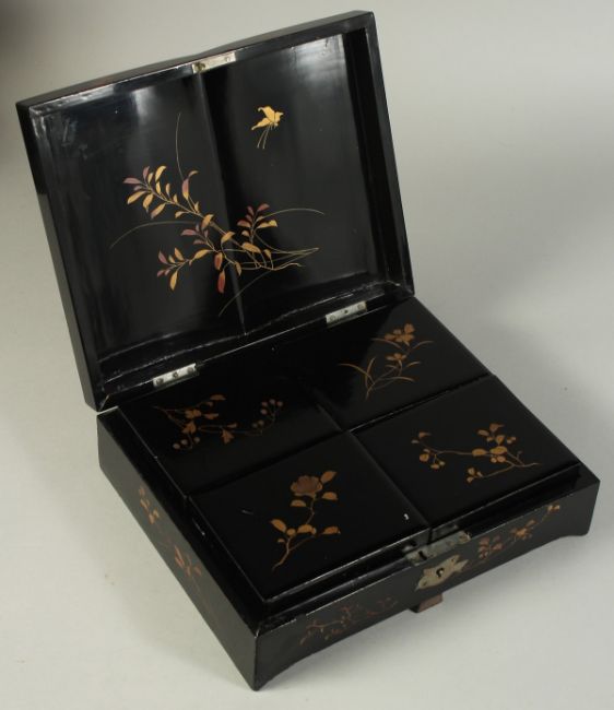 A JAPANESE BLACK AND GILT LACQUER GAMING BOX, comprising four lidded compartments containing gaming counters.