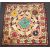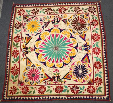 AN INDIAN RAJASTHAN EMBROIDERED FLORAL TEXTILE PANEL, inscribed and inset with small circular mirror glass pieces, 180cm x 174cm.