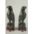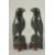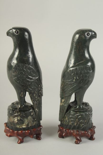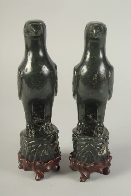 A PAIR OF CHINESE CARVED DARK GREEN HARDSTONE BIRDS, mounted to fitted carved hardwood stands raised on four feet, 26cm high.