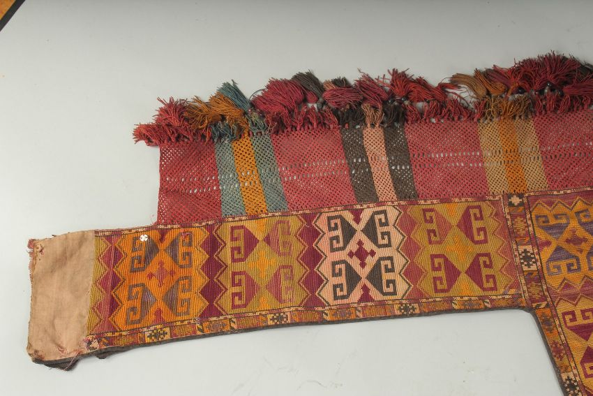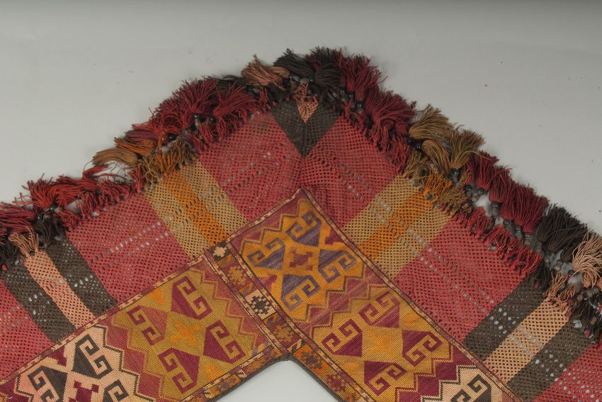 A VERY FINE 19TH CENTURY CENTRAL ASIAN EMBROIDERED HORSE COLLAR TEXTILE, with white metal beads.