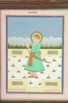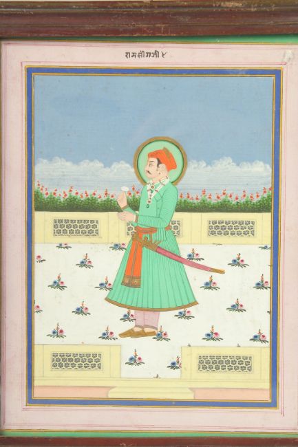 A 19TH CENTURY INDIAN MINIATURE PAINTING, depicting a standing nobleman, 24cm x 19cm.