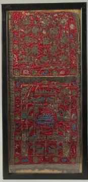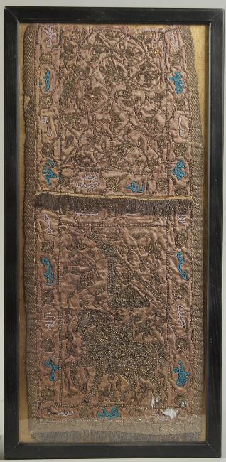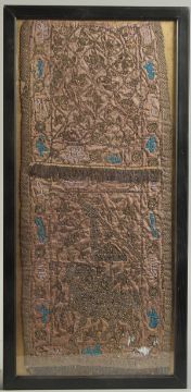 A FINE PAIR OF EARLY 19TH CENTURY INDIAN DECCANI METAL THREAD AND GLASS BEAD EMBROIDERED TEXTILE PANELS, one depicting a horse, the other depicting a mosque, framed and glazed, 54cm x 23cm, (2).