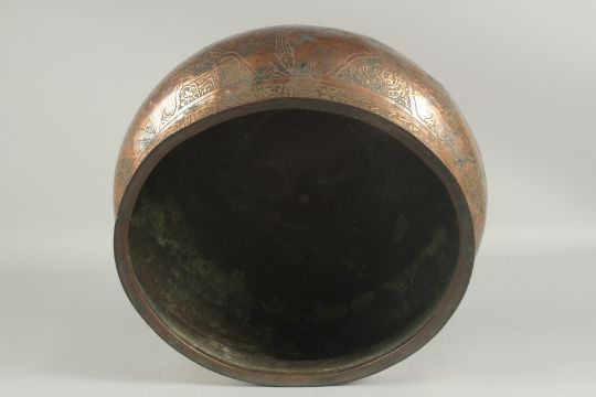 A LARGE 17TH CENTURY TINNED COPPER BASIN, with calligraphy and engraved fish decoration, possibly Deccani or Safavid Persian, 36cm diameter.