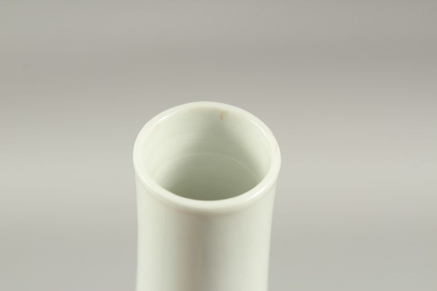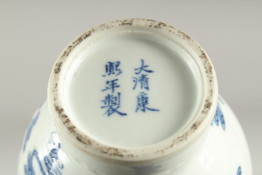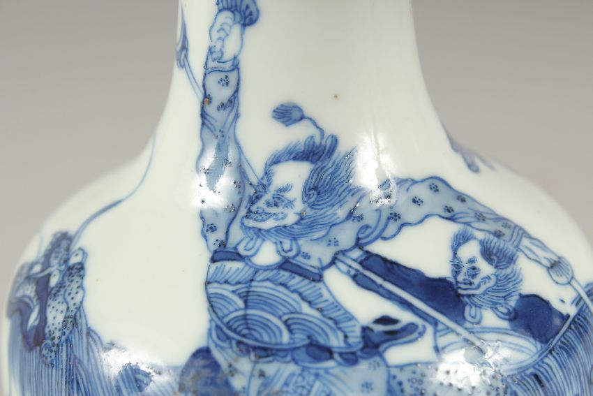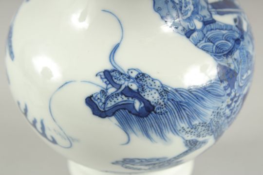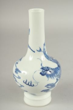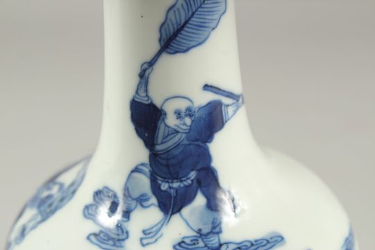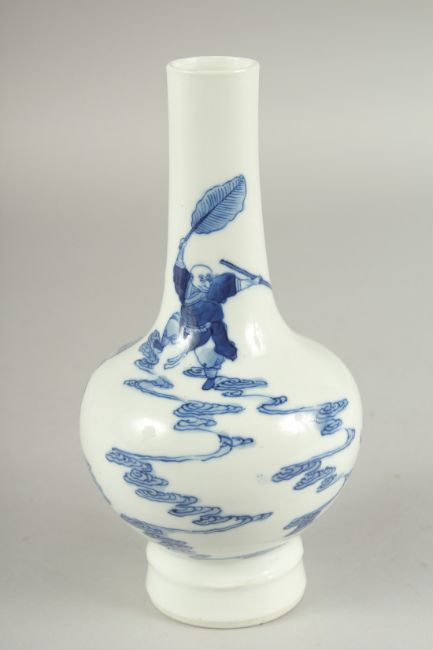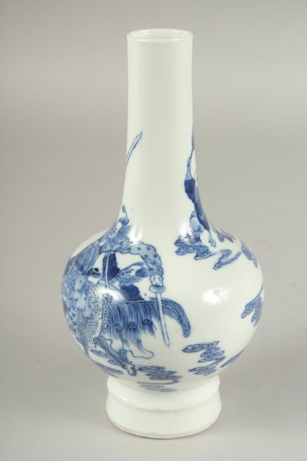 A FINE CHINESE BLUE AND WHITE PORCELAIN BOTTLE VASE, painted with an immortal riding a dragon-like beast, the base with six-character mark, 20cm high.