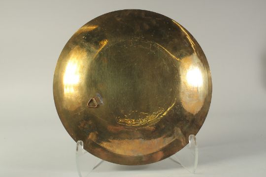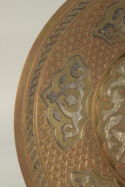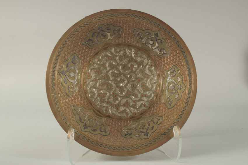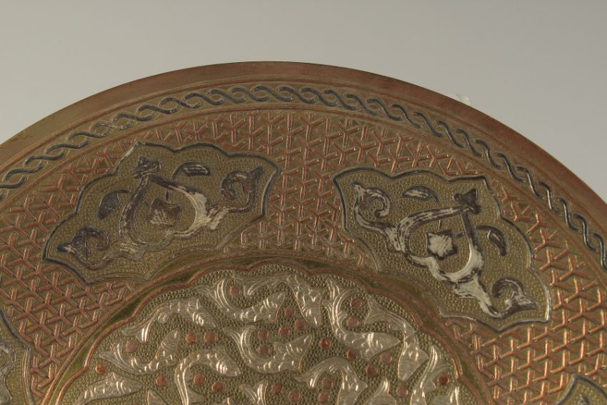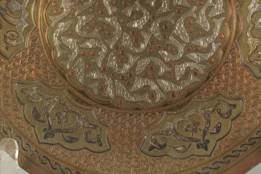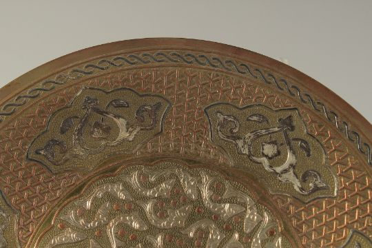 A FINE 19TH-20TH CENTURY CAIROWARE SILVER AND COPPER INLAID HEAVY BRASS DISH, with fish designs, 33cm diameter.