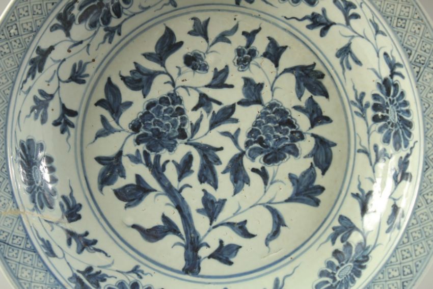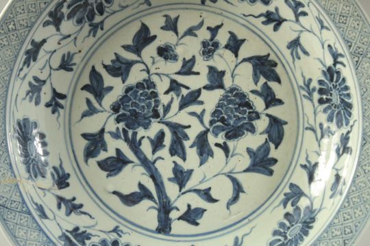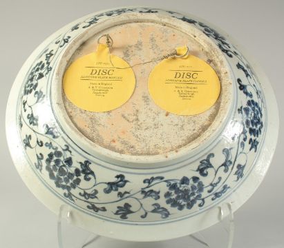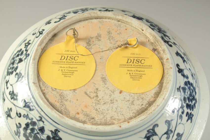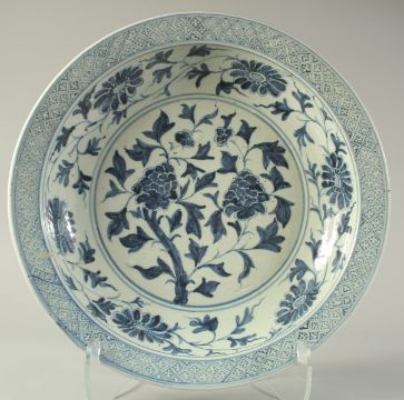 A CHINESE BLUE AND WHITE PORCELAIN FLORAL CHARGER, with central floral spray and further foliate border with large flower heads, 41cm diameter.