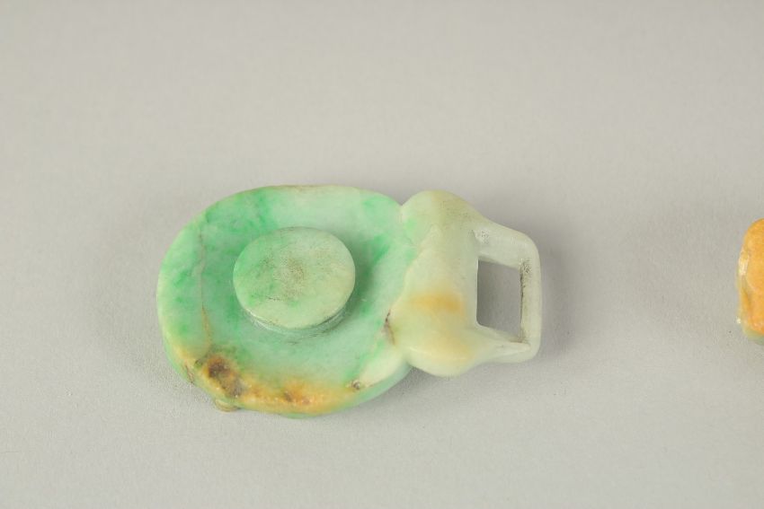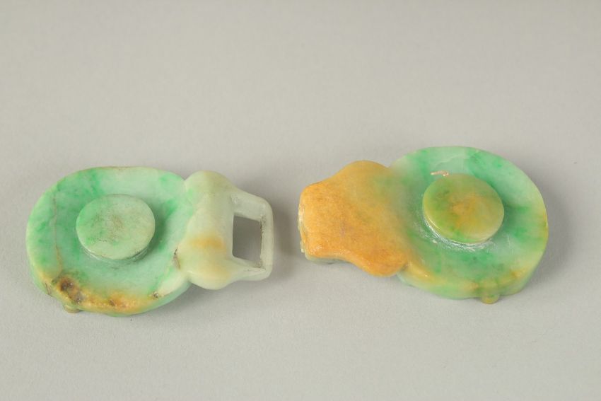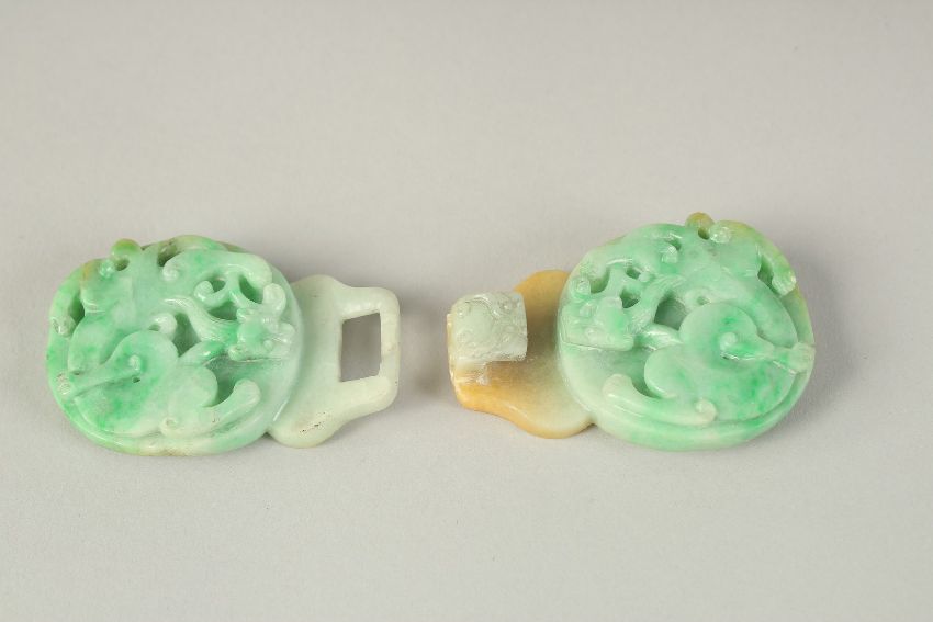 TWO FINE CHINESE CARVED JADE INTERLOCKING BELT HOOK PIECES, each piece 6cm wide, (2).