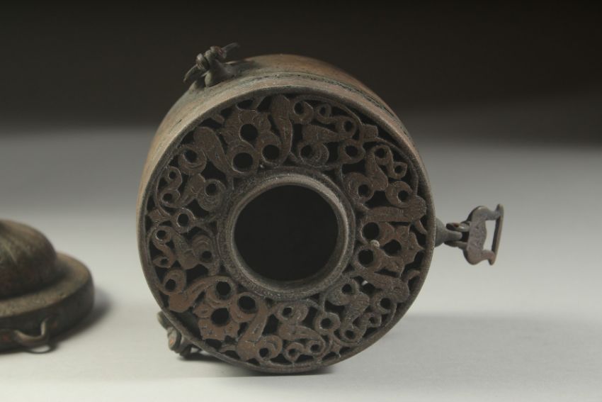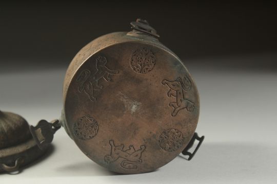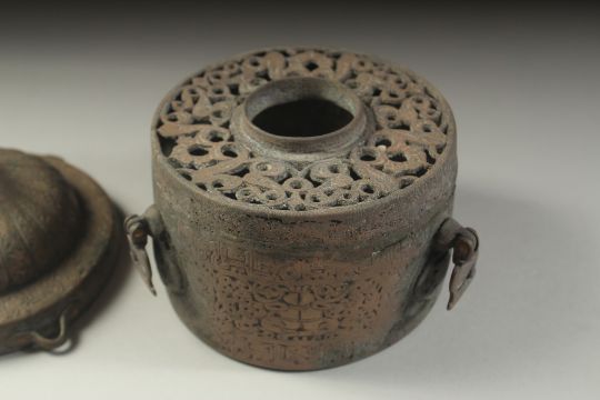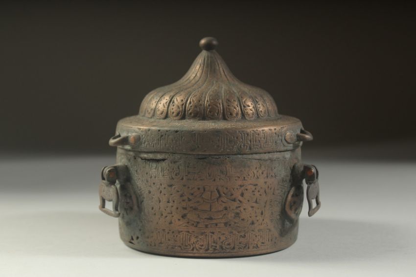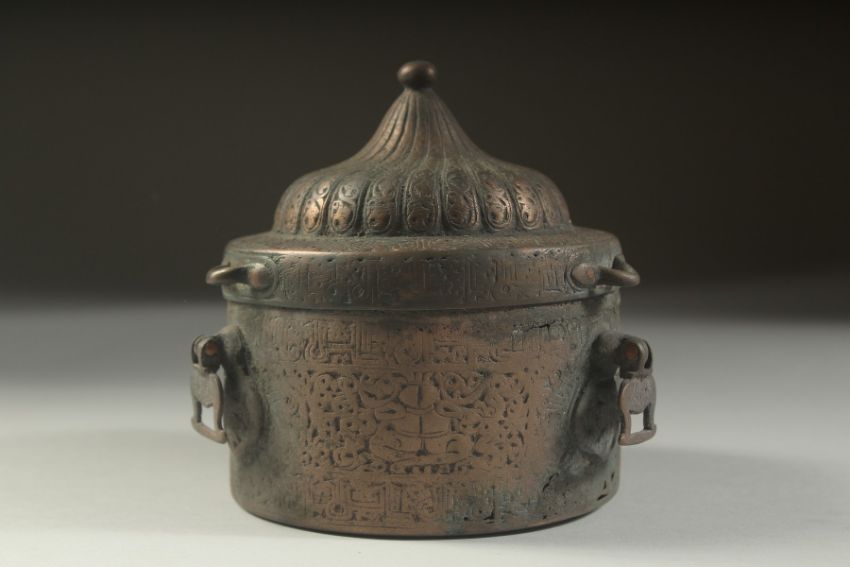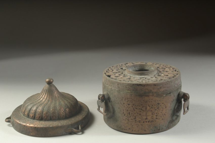 A VERY RARE FINE AND LARGE 12TH-13TH CENTURY PERSIAN SELJUK KHURASAN BRONZE INKWELL, with fine turban shaped cover, decorated with Kufic calligraphy a royal seated figures to the sides, with lions to the base, fine openworked interior, 10cm across.