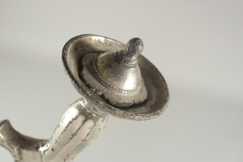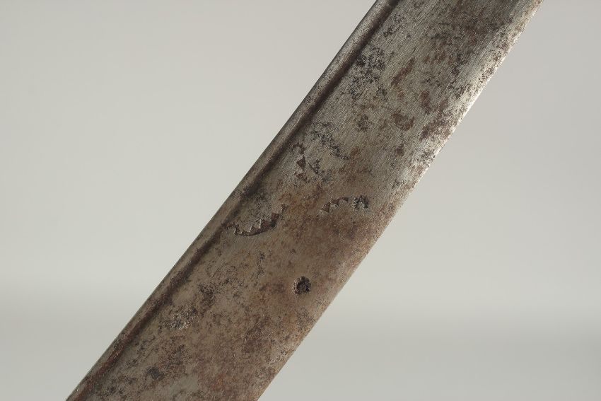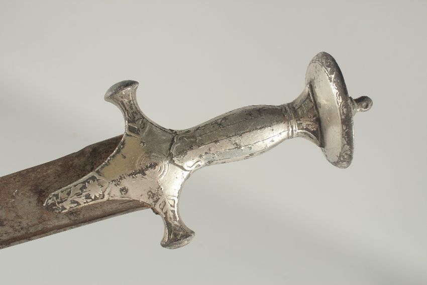 AN 18TH CENTURY MUGHAL INDIAN TULWAR SWORD, with silver inlaid hilt, 80cm long.