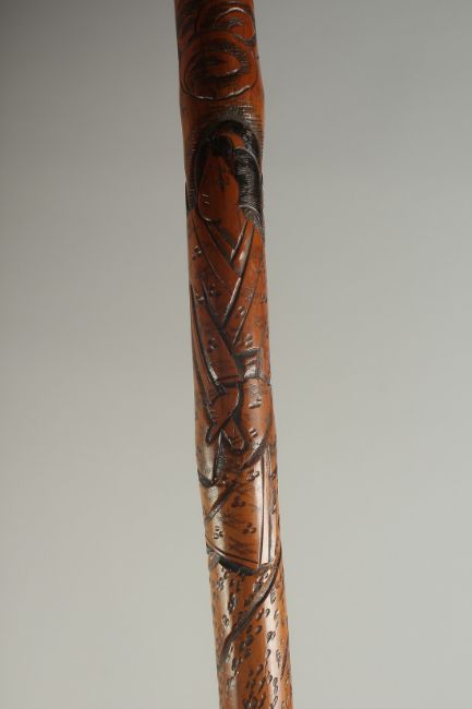 A CHINESE BAMBOO WALKING STICK, carved with bird, dragon, and a female figure, 89cm long.