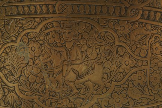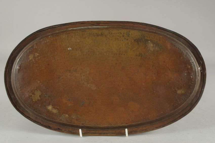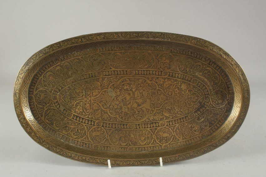A 19TH CENTURY QAJAR ENGRAVED BRASS OVAL TRAY, 38cm x 21.5cm.