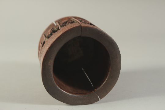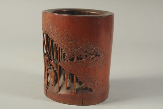 A CHINESE CARVED BAMBOO BRUSH POT, the side carved with a scene of figures amongst bamboo, 14.5cm high.