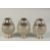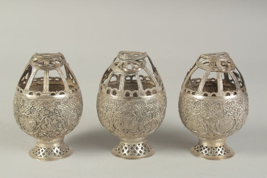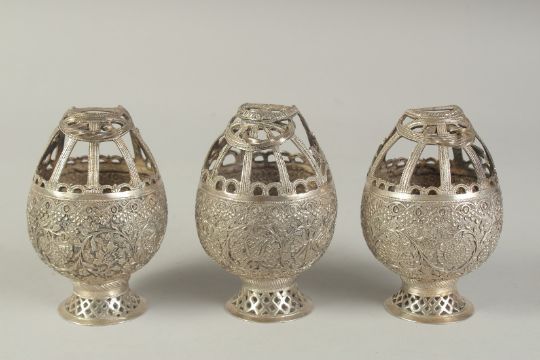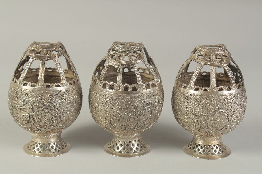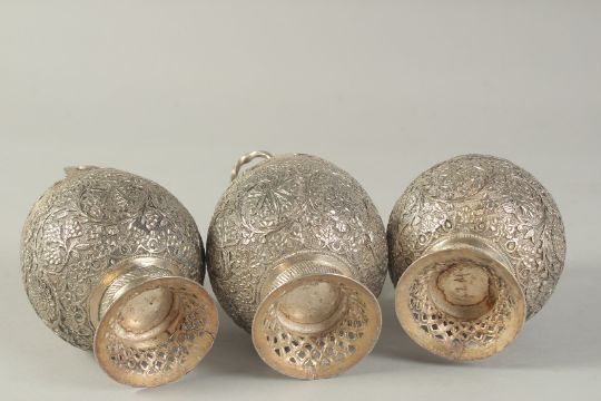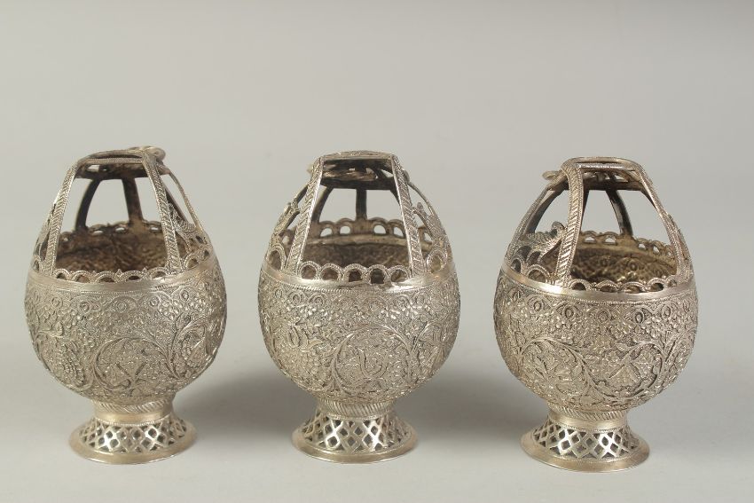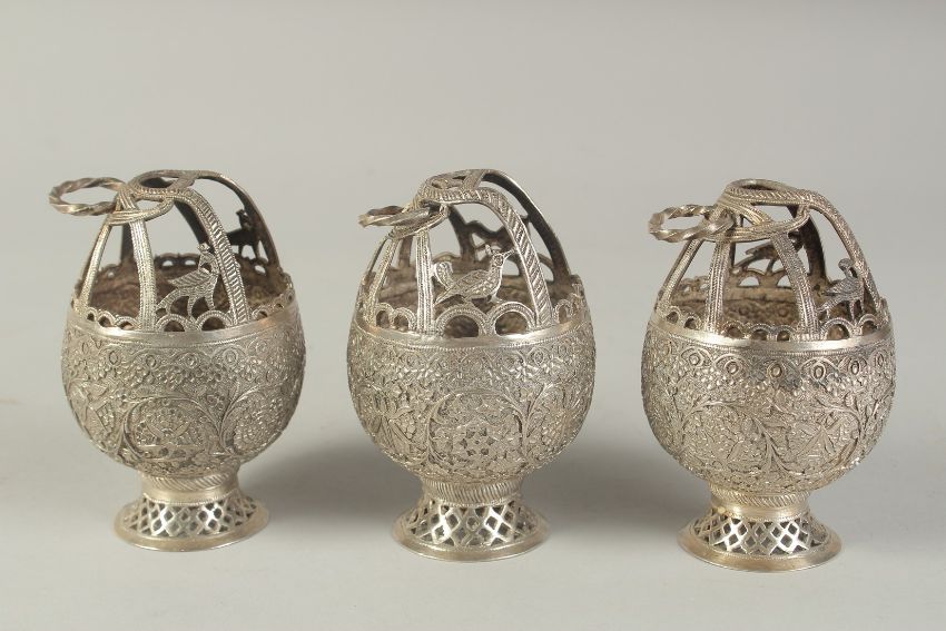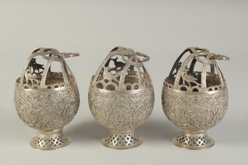 THREE KASHMIRI FINELY EMBOSSED AND CHASED WHITE METAL HANGING INCENSE BURNERS, decorated with exotic birds and flora, 12cm high, (3).