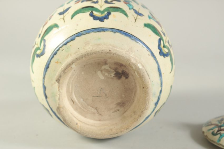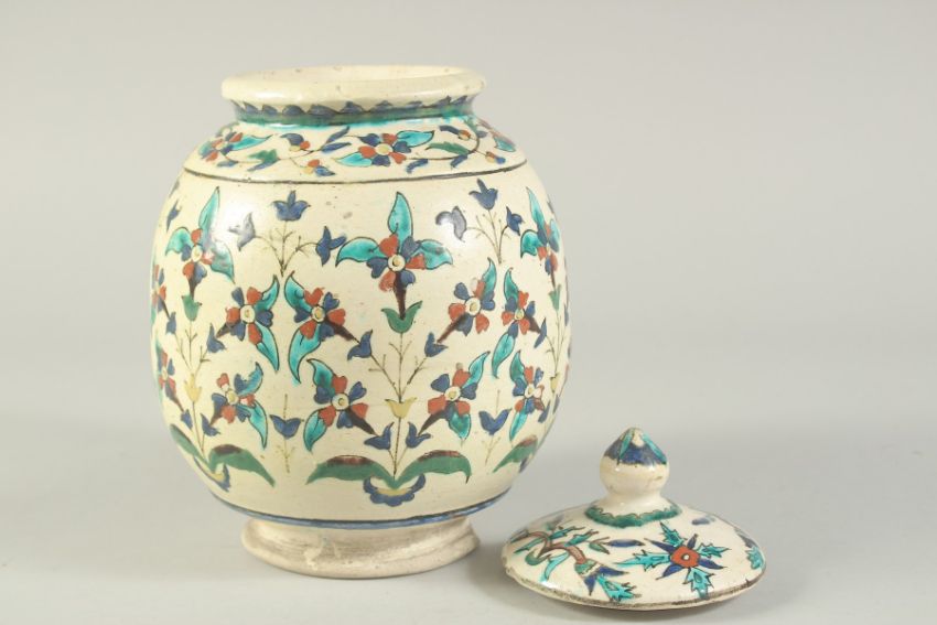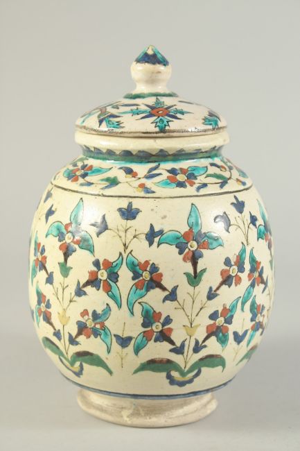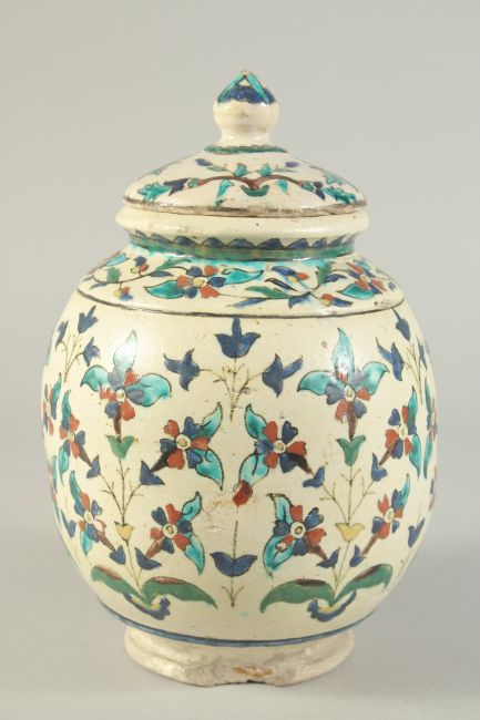 A FINE 19TH CENTURY OTTOMAN TURKISH KUTAHIYA LIDDED JAR, with floral decoration, 25cm high.