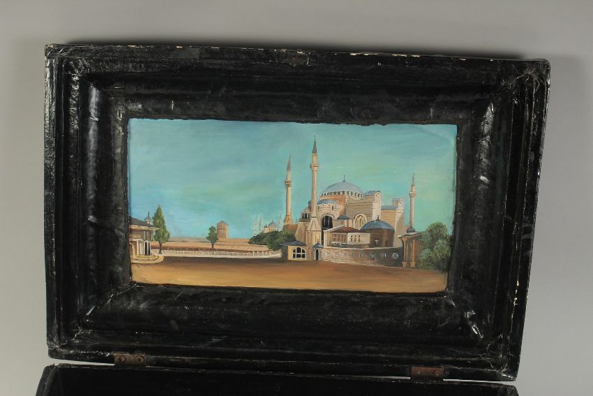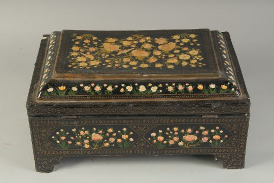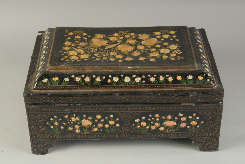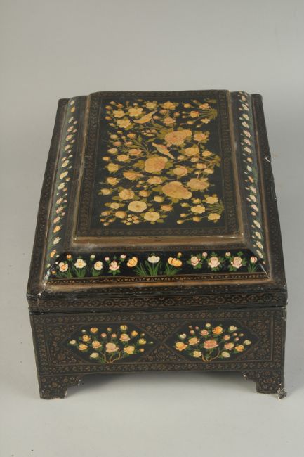 A TURKISH OTTOMAN LACQUERED WRITING BOX, with hinged lid, painted with birds and flora, 38.5cm x 26cm.