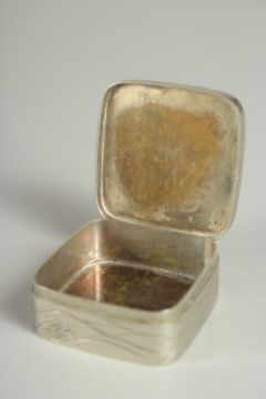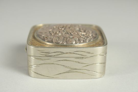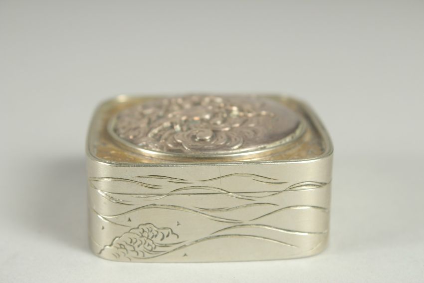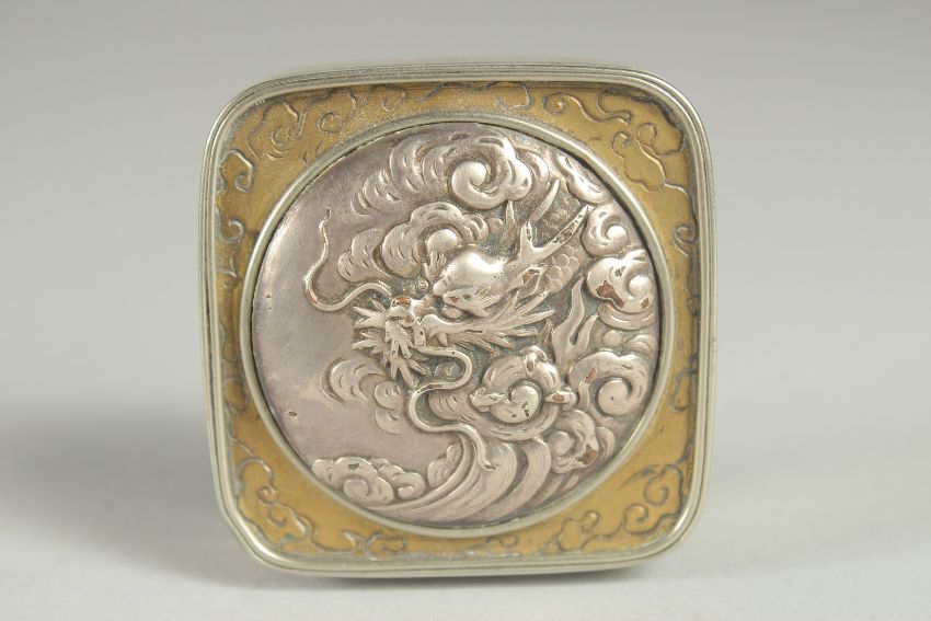 A SMALL SIGNED JAPANESE WHITE METAL AND BRASS BOX, the hinged lid with relief dragon roundel, 5cm square.