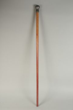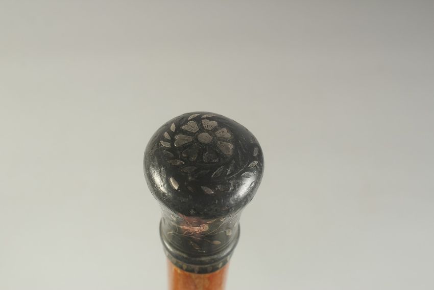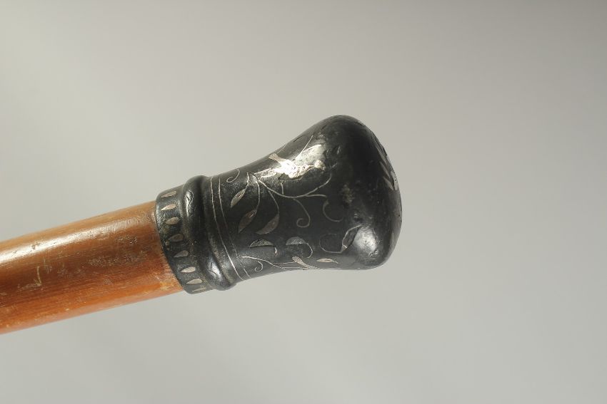 A WOODEN WALKING STICK WITH INDIAN BIDRI SILVER INLAID KNOB, 89cm long.