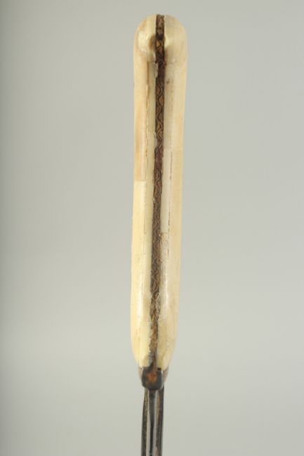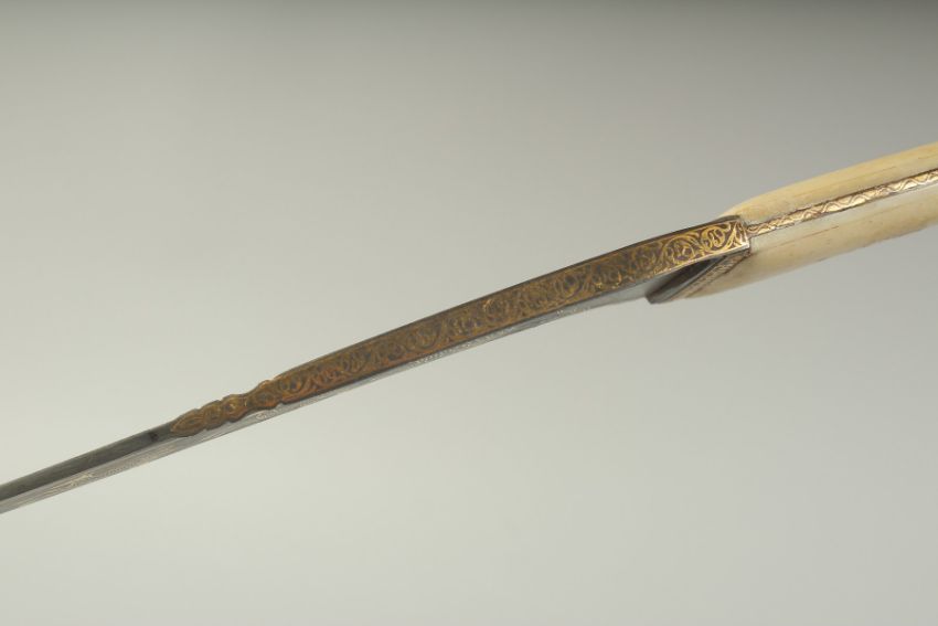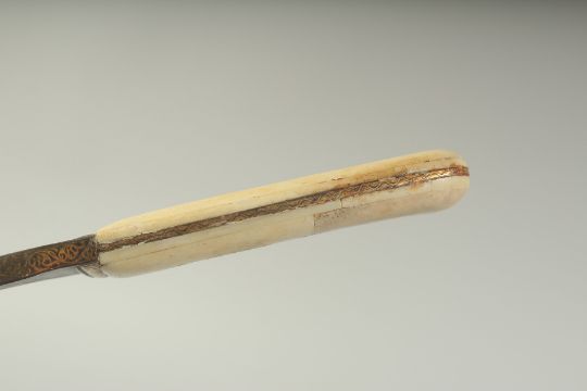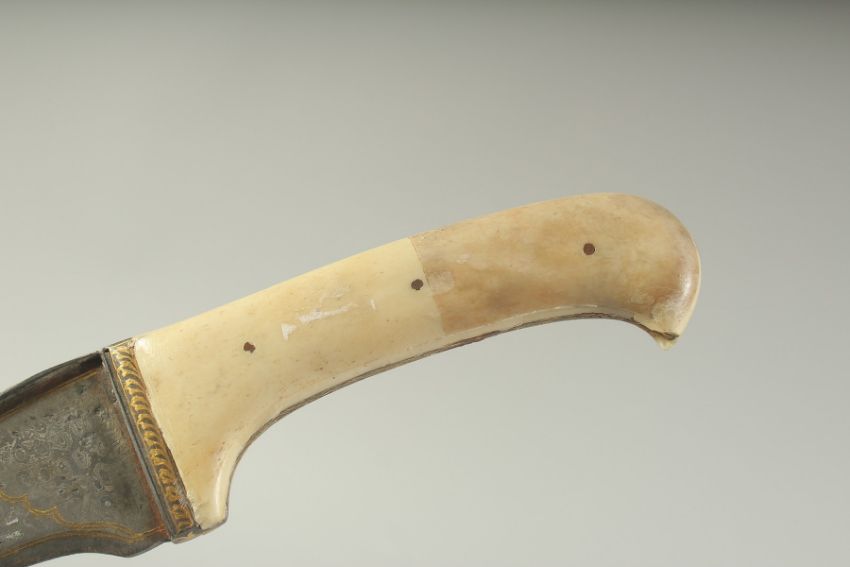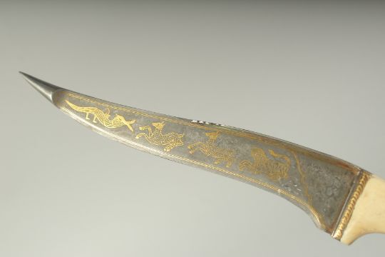 A VERY AND LARGE INDIAN GOLD INLAID WATERED STEEL DAGGER, with bone handle, blade decorated with gold animals, 42cm long.