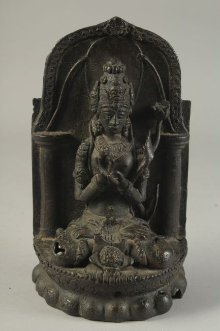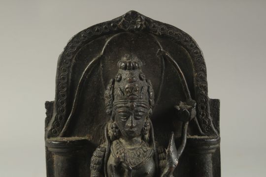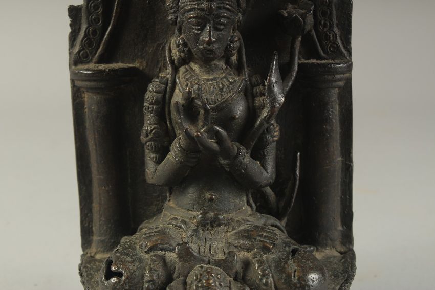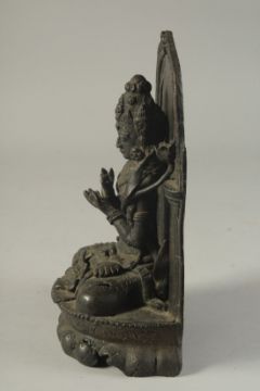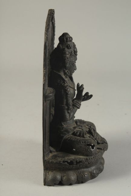 A FINE 19TH CENTURY OR EARLIER BRONZE SEATED DEITY, 23.5cm high.