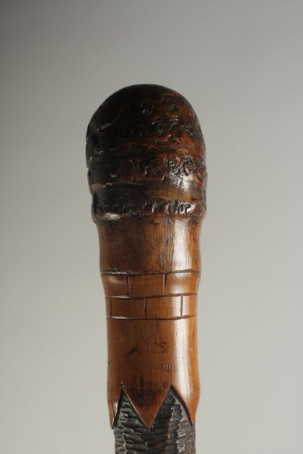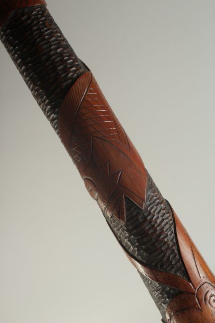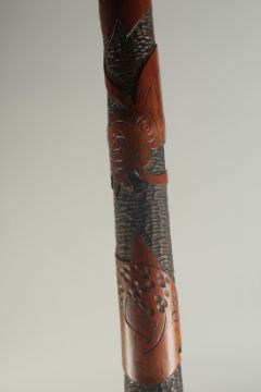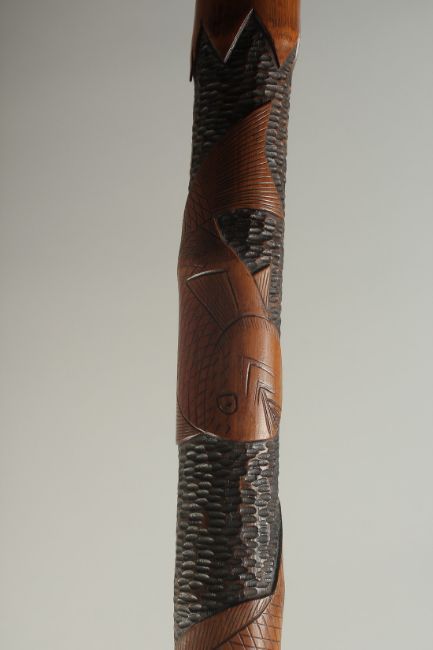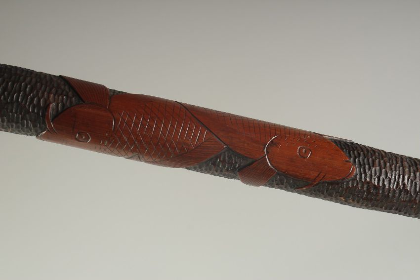 A CHINESE BAMBOO WALKING STICK, carved with fish, 90cm long.