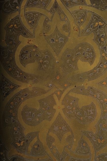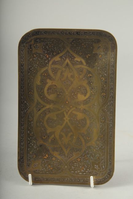 A FINE 19TH CENTURY OTTOMAN SILVER AND GOLD INLAID BRASS TRAY, 19.5cm x 12cm.