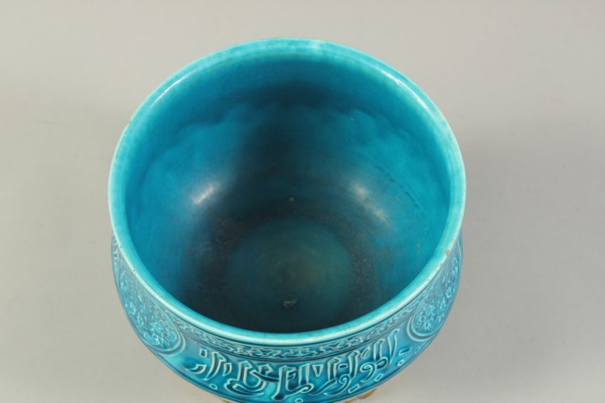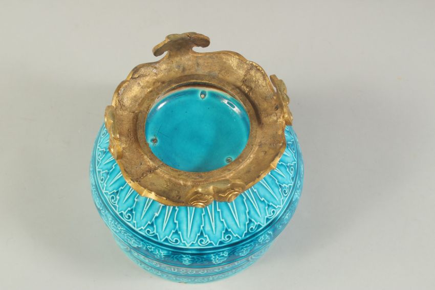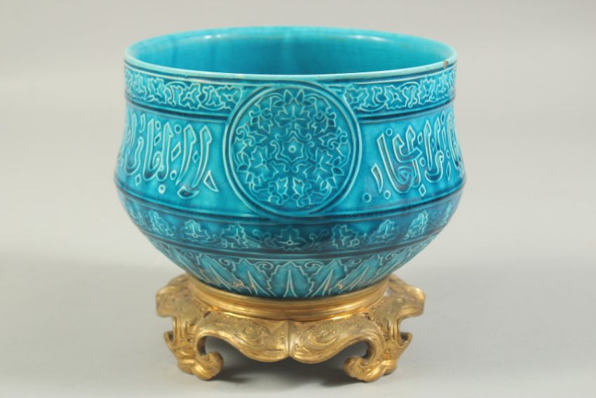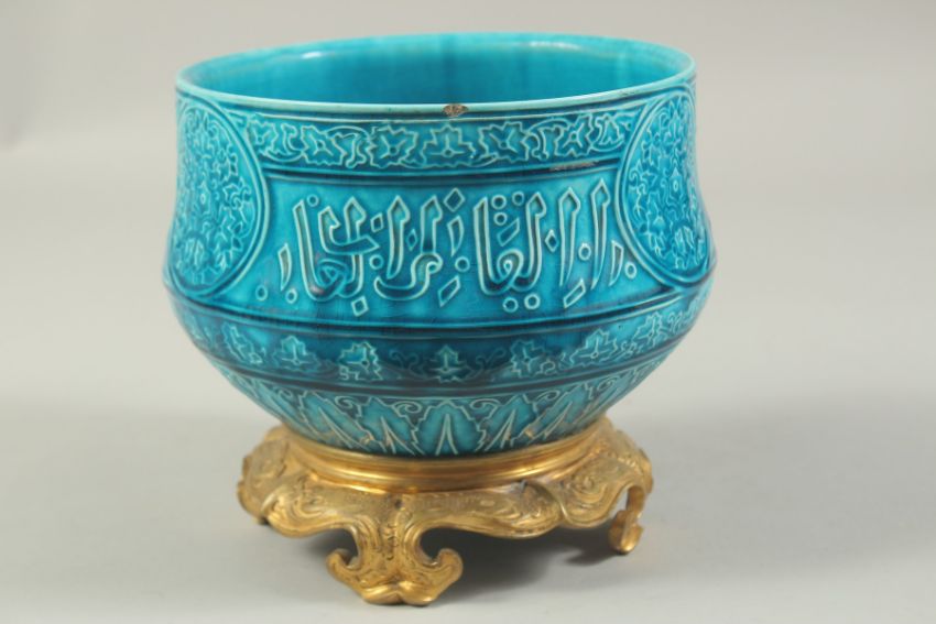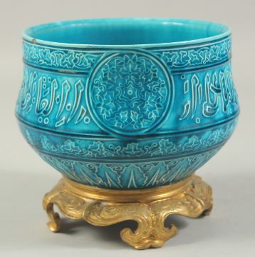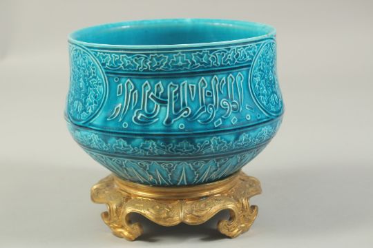 A FINE 19TH CENTURY FRENCH TURQUOISE GLAZED PORCELAIN BOWL, with Islamic calligraphy and decorated with three floral roundels and foliate bands, the base with mounted ormolu stand, 18cm diameter, 17cm high.