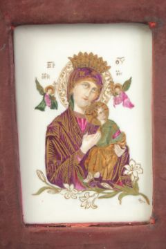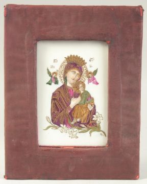 A PORCELAIN PANEL DEPICTING MADONNA AND CHILD, with gilded highlights, in fabric overlaid wooden frame, 35cm x 27.5cm overall.