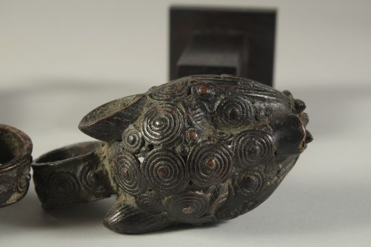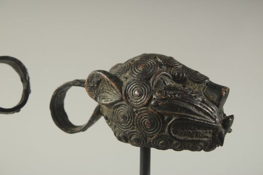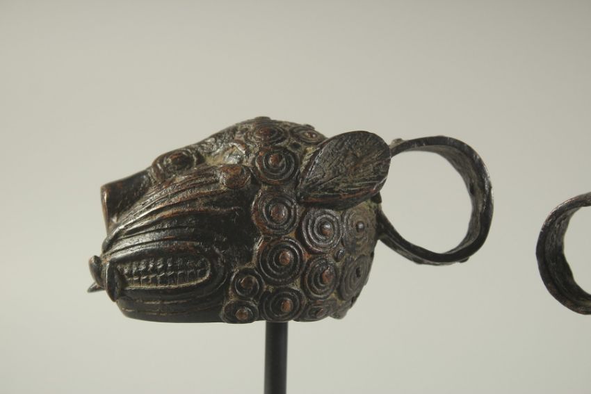 A PAIR OF BINI / BENIN AFRICAN BRONZE MASQUE LEOPARD DANCE MASKS, elevated on wooden stands, the heads 13cm long, 25cm high on stand.