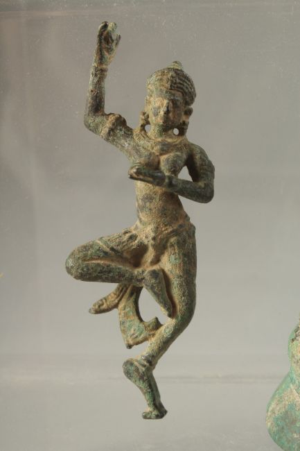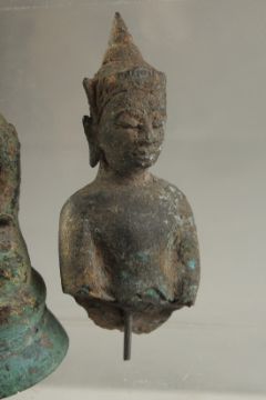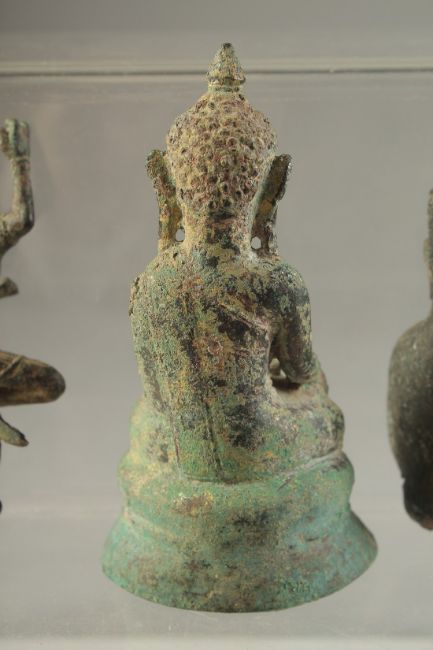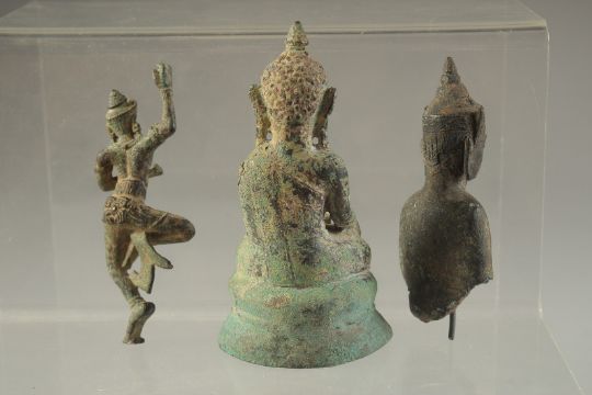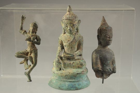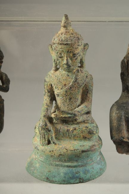 AN EARLY POSSIBLY 12TH CENTURY THAI OR BURMESE GILDED BRONZE BUDDHA, 11cm, together with another two early bronze figures, (3).