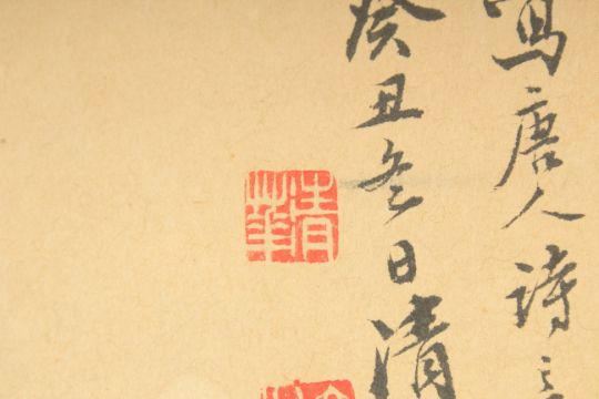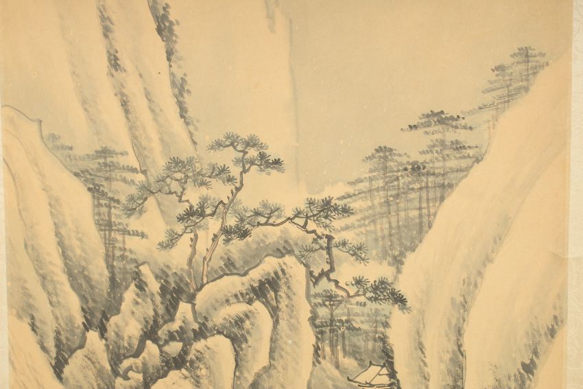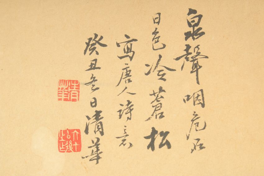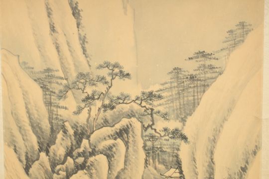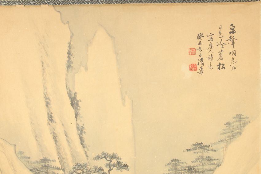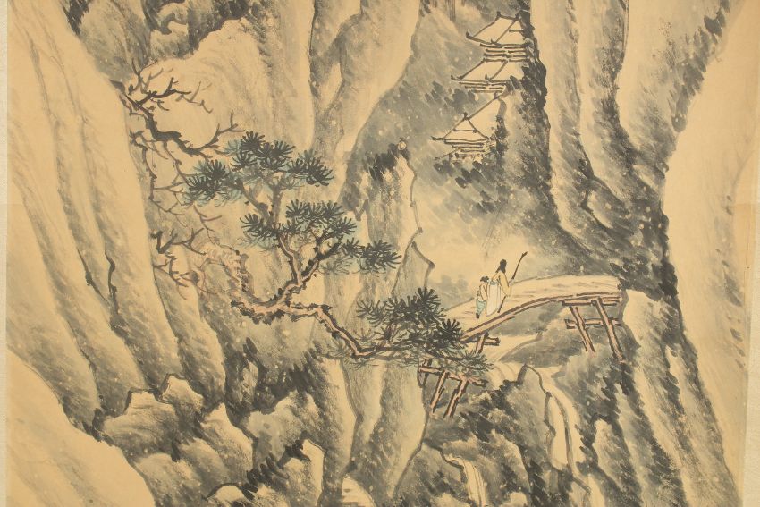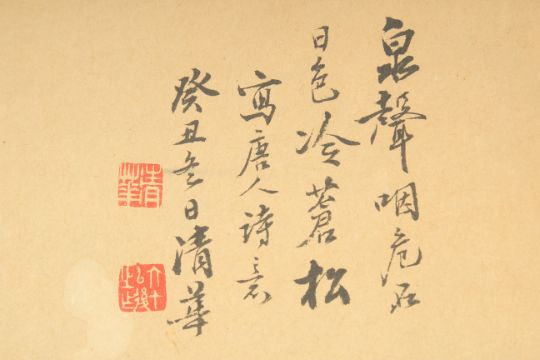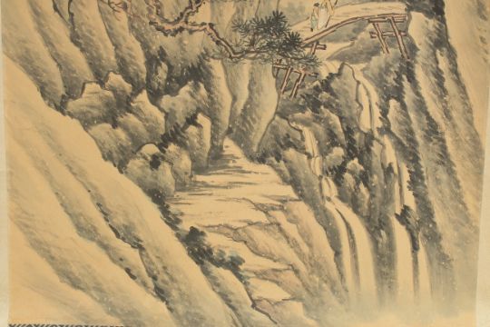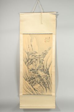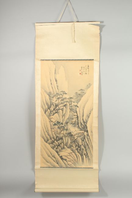 A CHINESE WATERCOLOUR PAINTING ON SILK SCROLL, depicting two figures approaching a temple in a mountainous landscape, with calligraphy to top right and two red seal marks, image 75cm x 37cm.