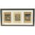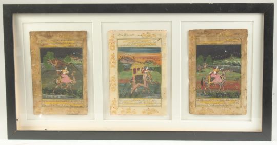 THREE 19TH CENTURY INDIAN MINIATURE PAINTINGS, heightened with gilt highlights, each with inscriptions, framed and glazed together, each leaf approx. 23cm x 15cm.