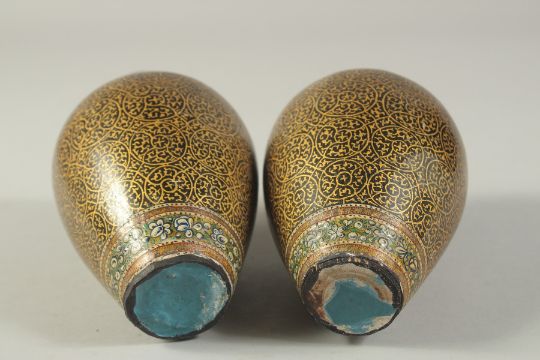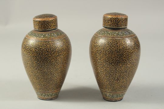 A PAIR OF 19TH CENTURY KASHMIRI LACQUERED LIDDED JARS, 16cm high.