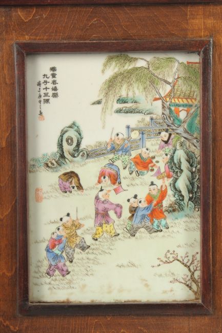 A CHINESE REPUBLIC FAMILLE ROSE PORCELAIN PLAQUE, inset within a hardwood frame, panel depicting an outdoor scene with boys, inscribed to upper left and bearing two red seals, 39cm x 32cm.