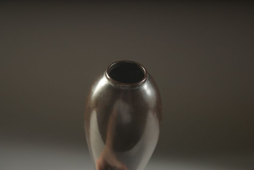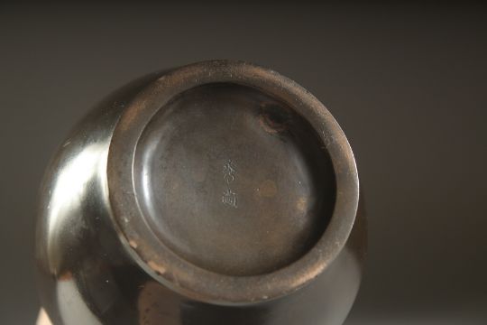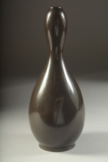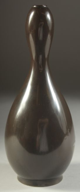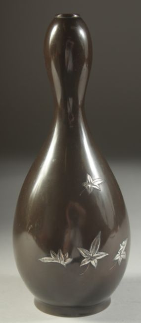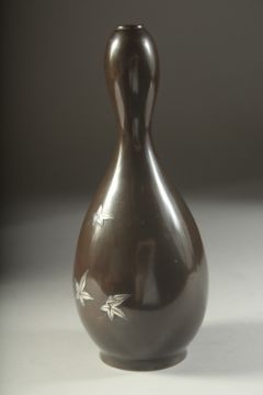 A FINE JAPANESE MEIJI PERIOD SIGNED DOUBLE GOURD BRONZE VASE, inlaid with silver leaves, signed to the base, 23cm high.