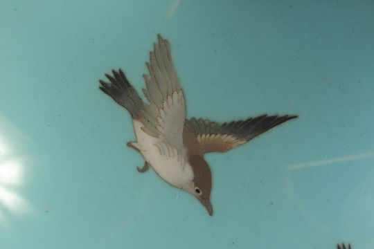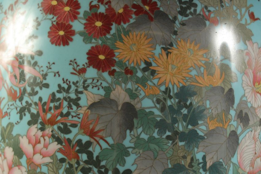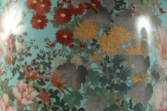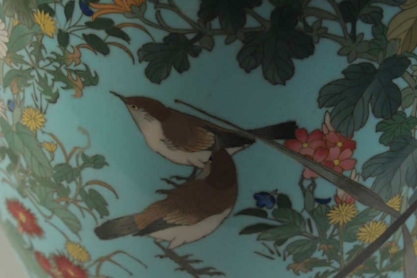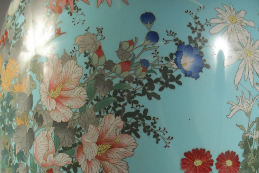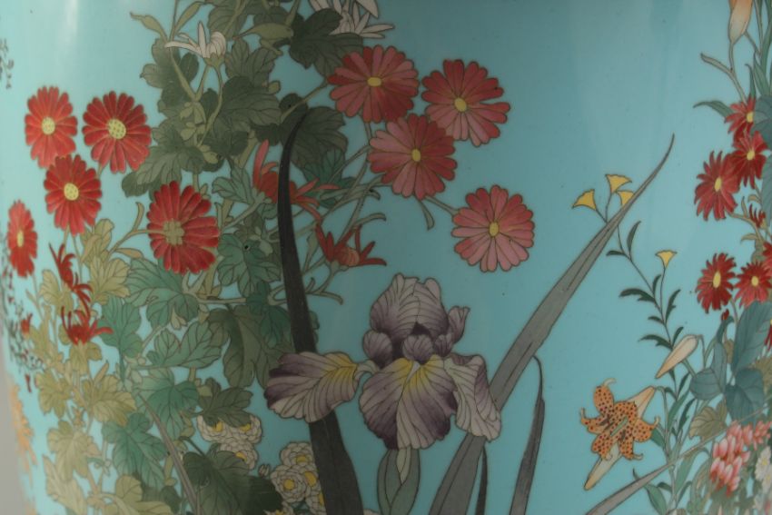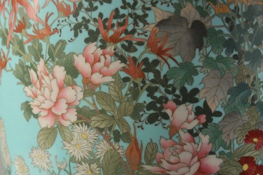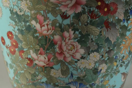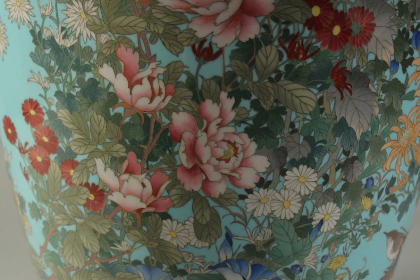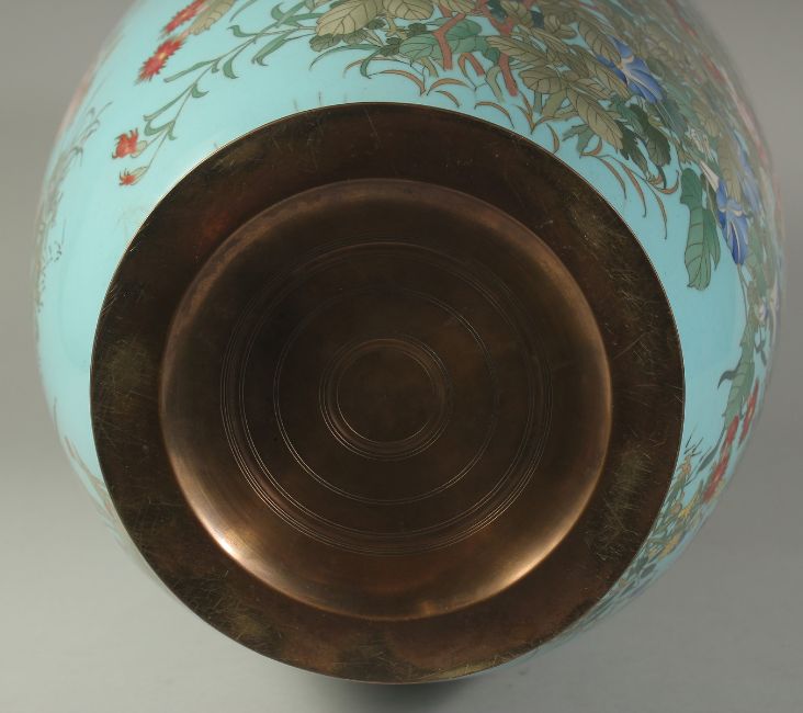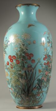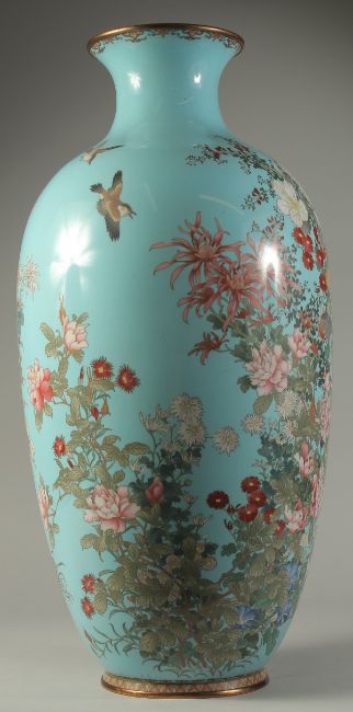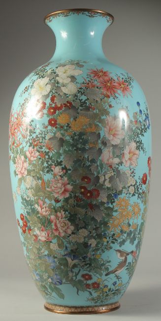 AN EXCEPTIONAL LARGE JAPANESE MEIJI PERIOD POWDER BLUE CLOISONNE VASE, with a large spray of very fine floral decoration of vibrant enamels and intricate wirework -further decorated with birds and butterfly, 62cm high.