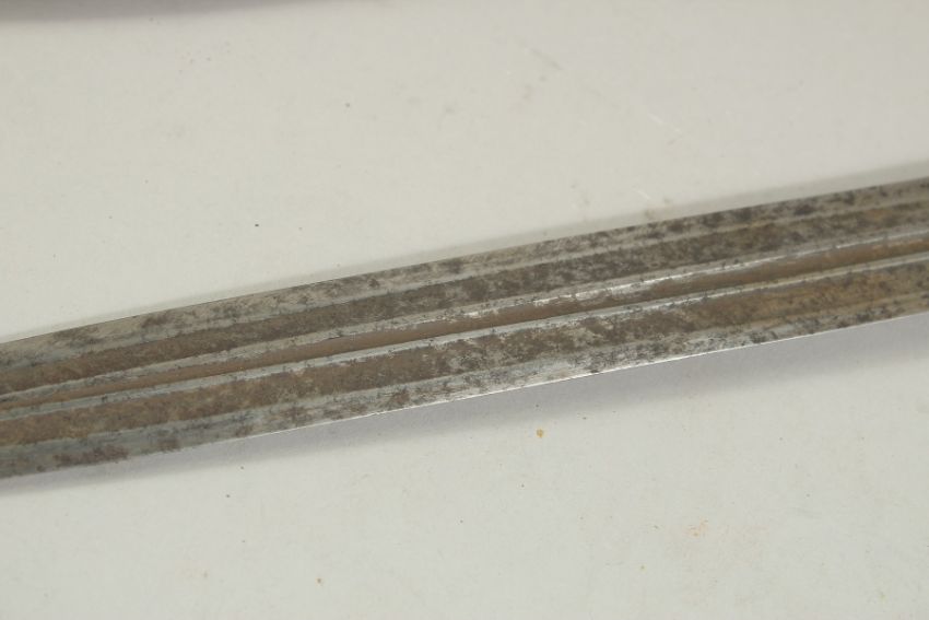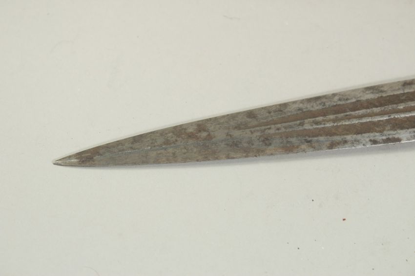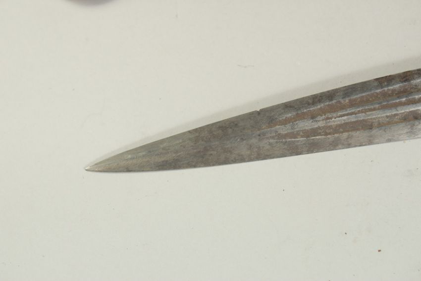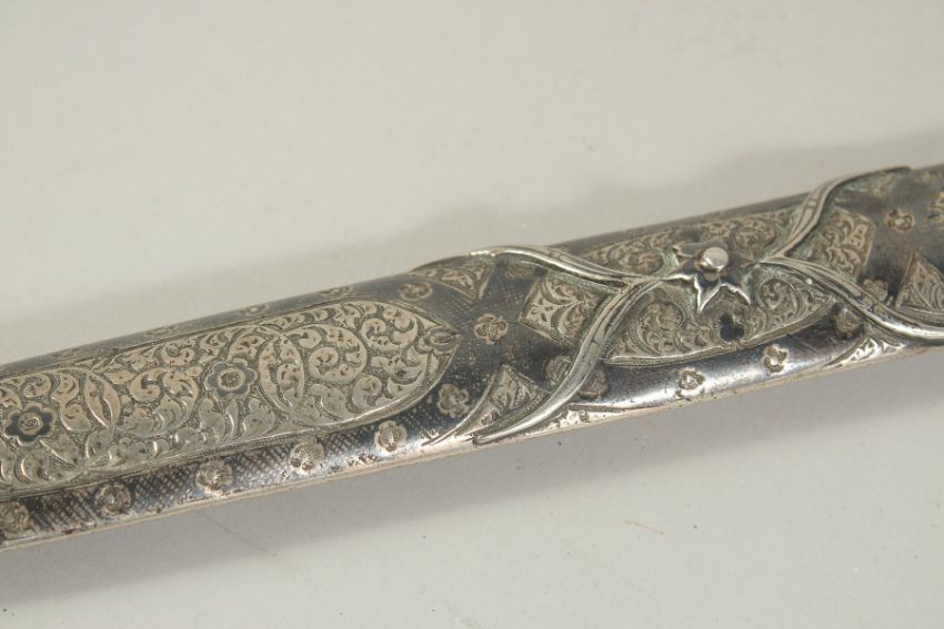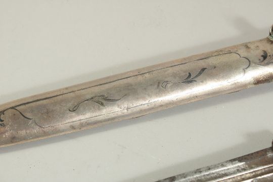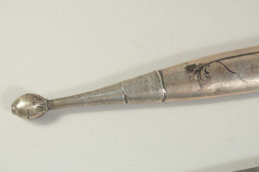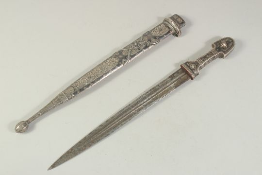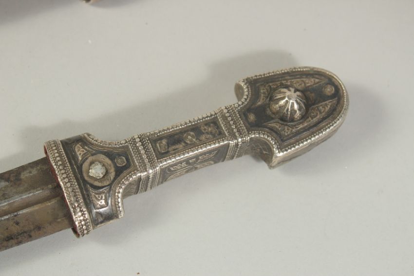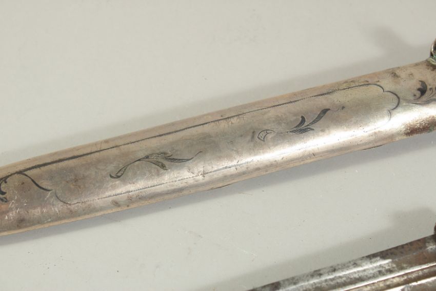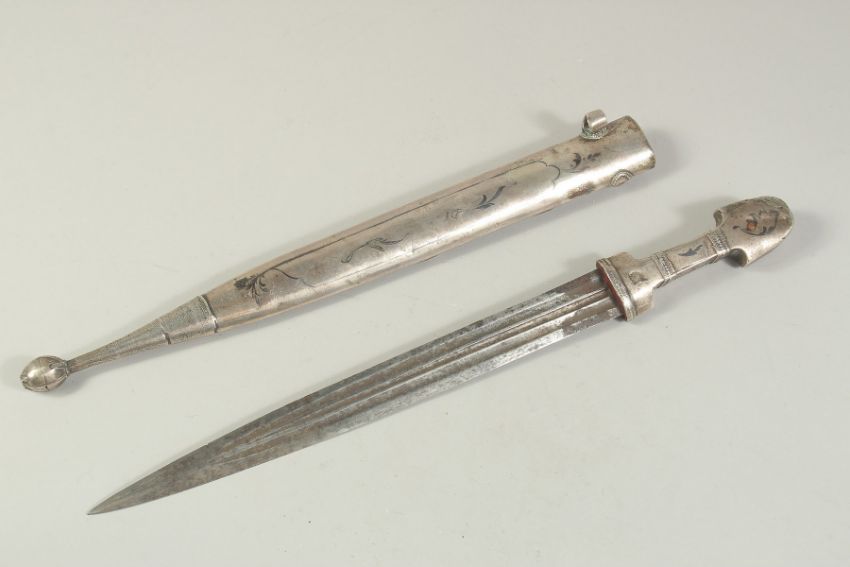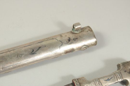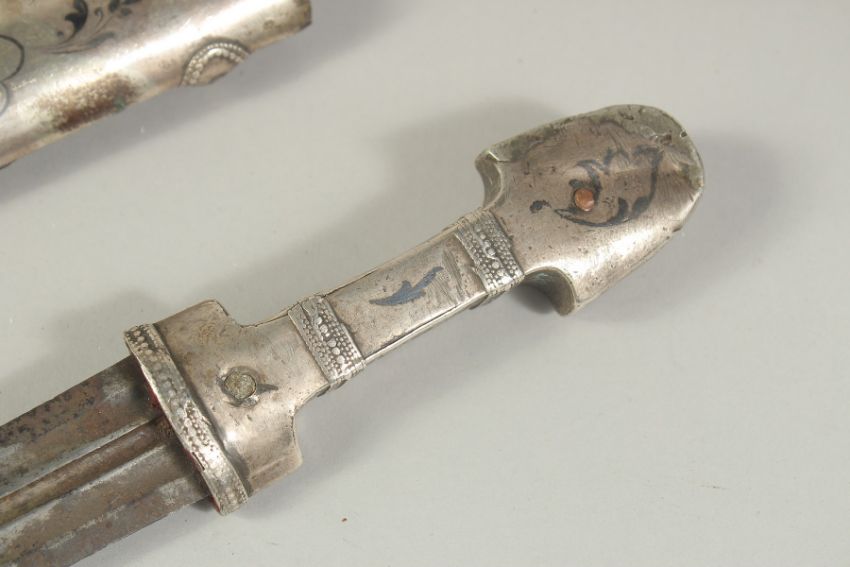 A 19TH CENTURY CAUCASIAN NIELLO SILVER KINDJAL DAGGER AND SCABBARD, with fullered blade, 49.5cm long.