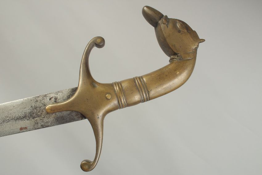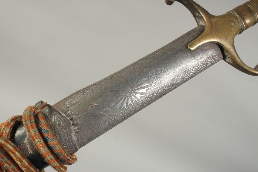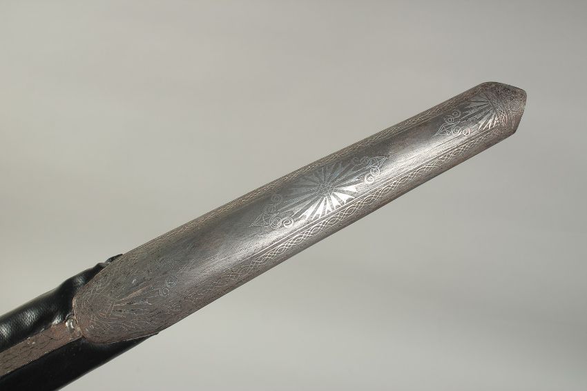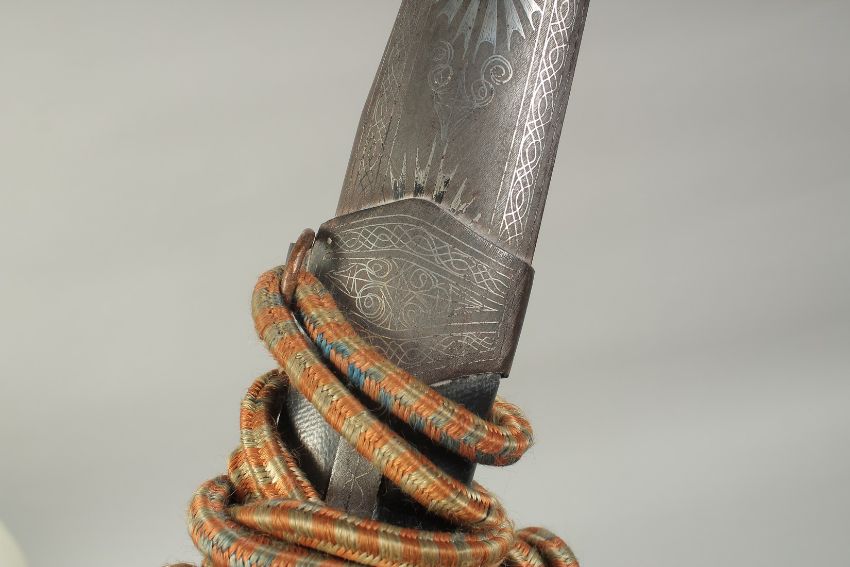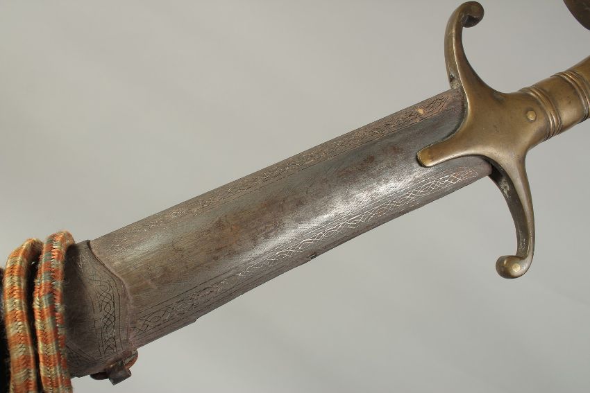 AN INDIAN SWORD WITH SILVER INLAID SCABBARD, 100cm long.