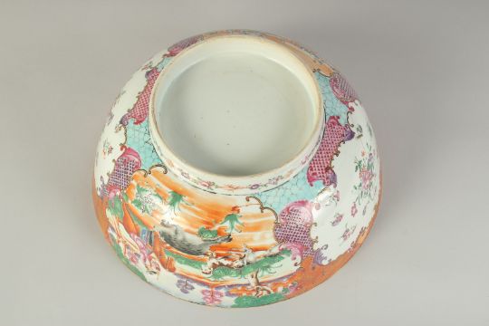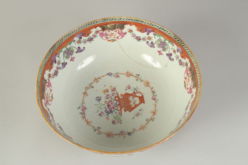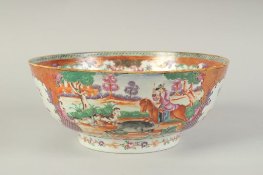 A CHINESE EXPORT FAMILLE ROSE PORCELAIN HUNTING SCENE PUNCH BOWL, painted with European figures on horseback, the interior painted with a vase of flowers, heightened with gilt highlights, 28.5cm diameter, (af).