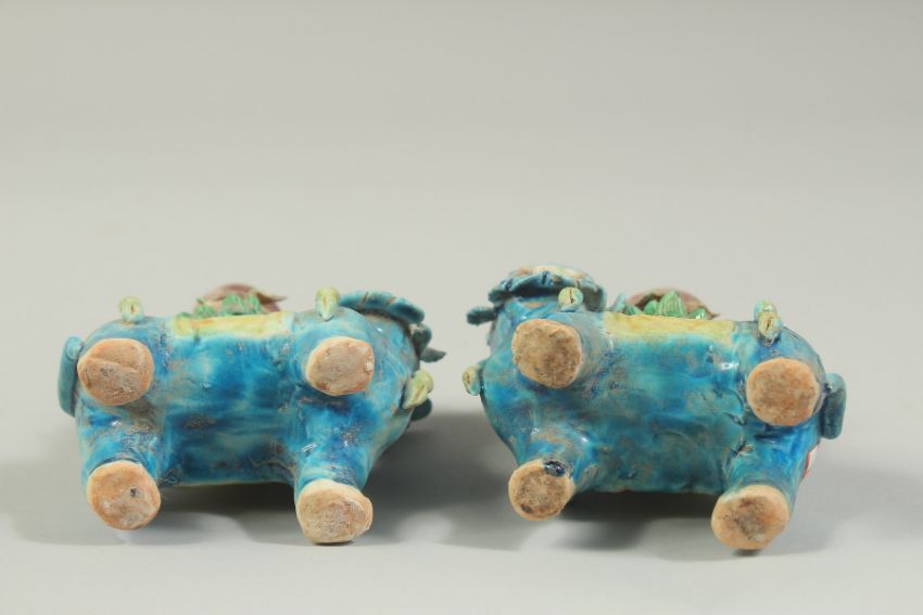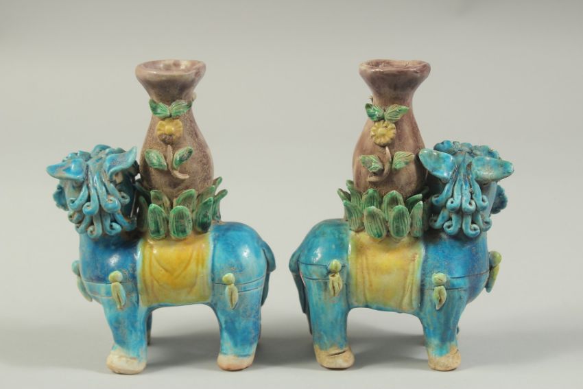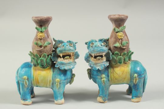 A PAIR OF SANCAI GLAZED POTTERY LION CANDLESTICKS, 16cm high.