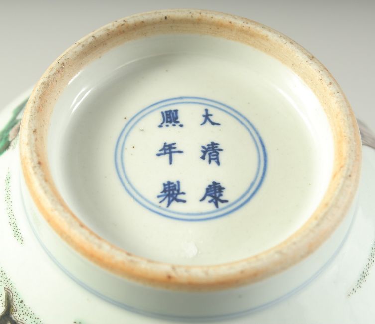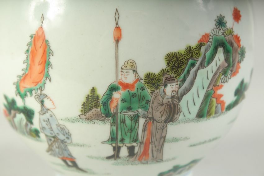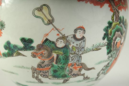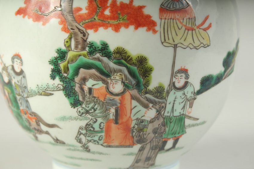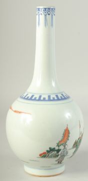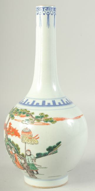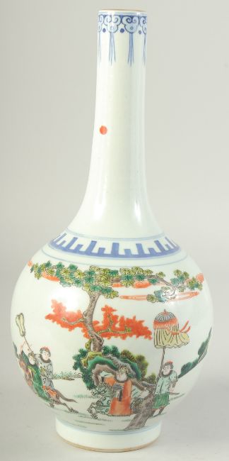 A CHINESE POLYCHROME PORCELAIN BOTTLE VASE, painted with figures on horseback, the base with six-character mark, 33cm high.