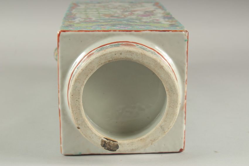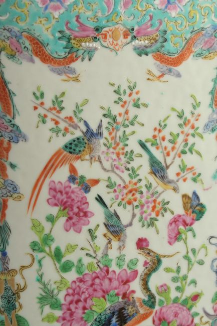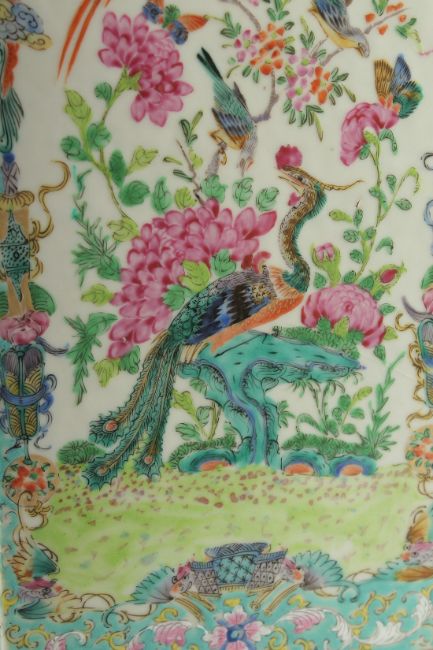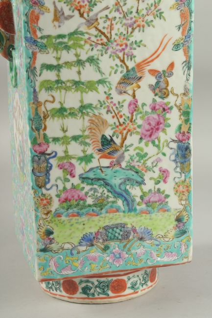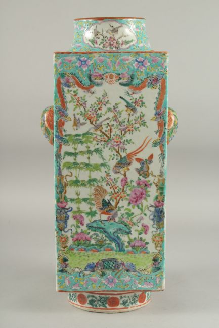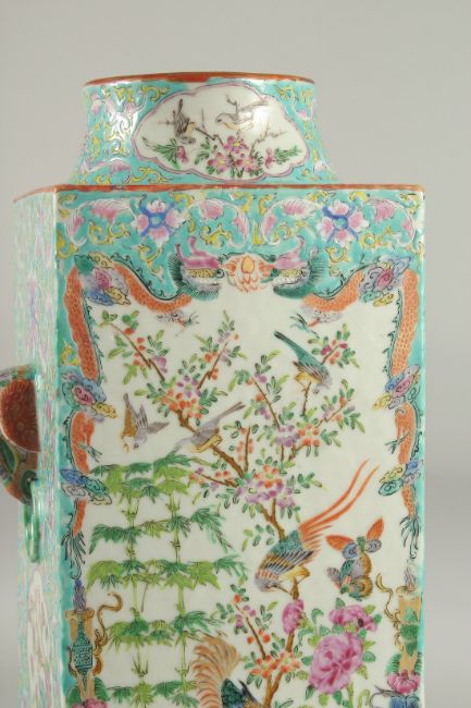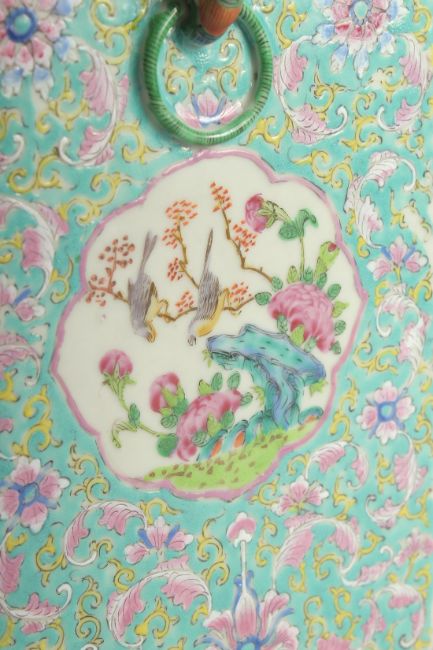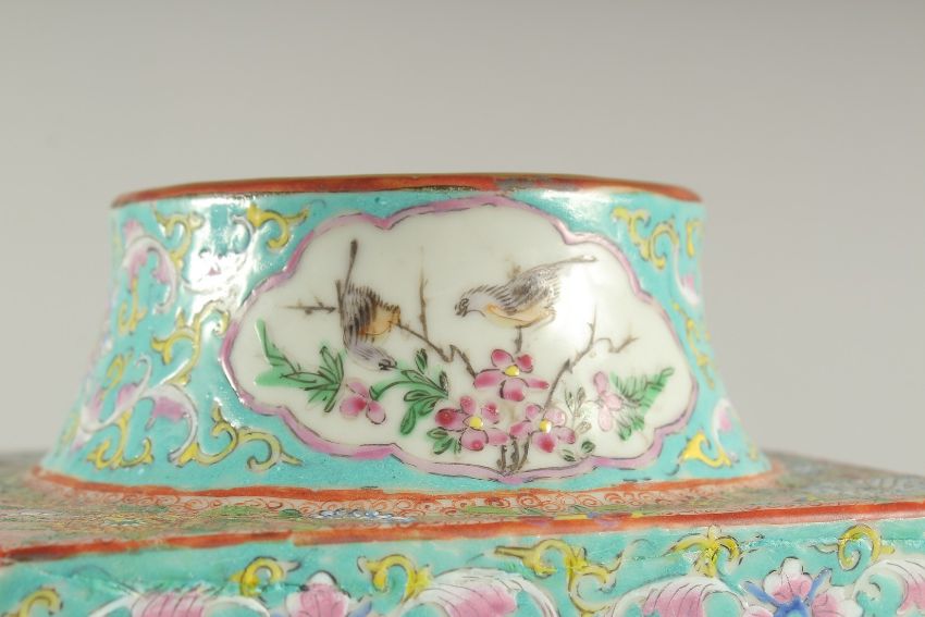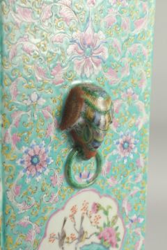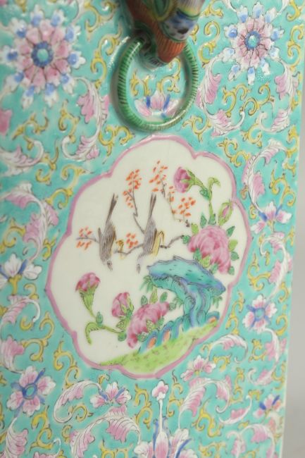 A CHINESE TURQUOISE GROUND FAMILLE ROSE PORCELAIN VASE, beautifully painted with panels of exotic birds and flora, with moulded elephant formed drop-ring handles, 40.5cm high (faults).