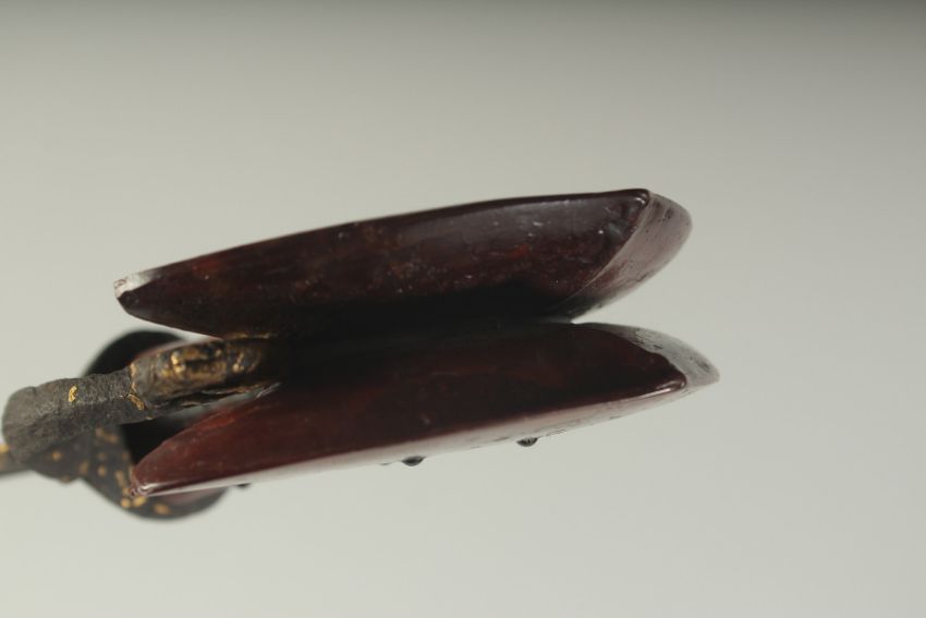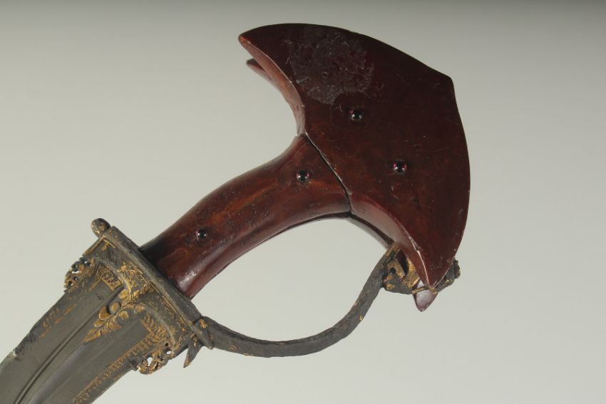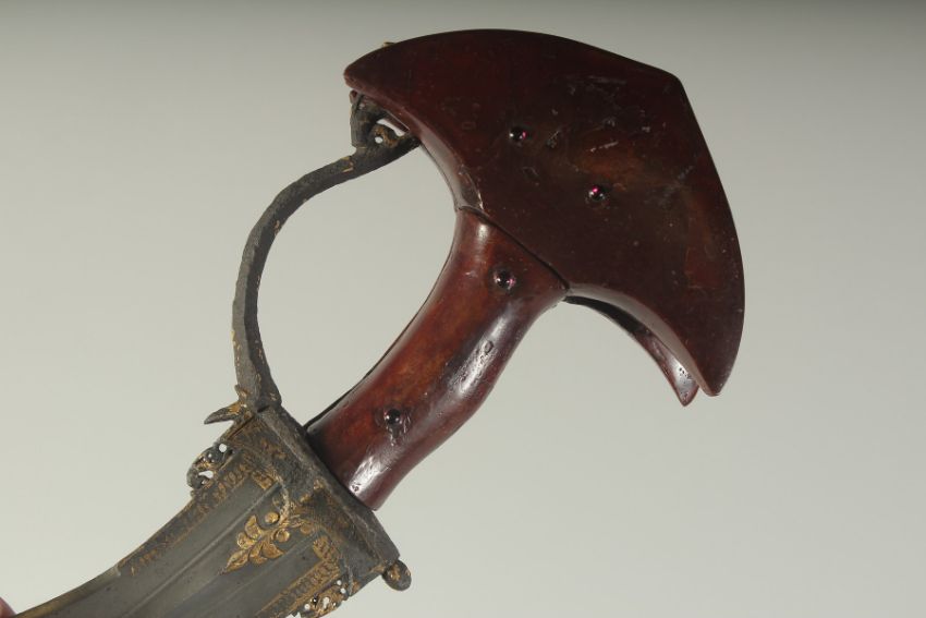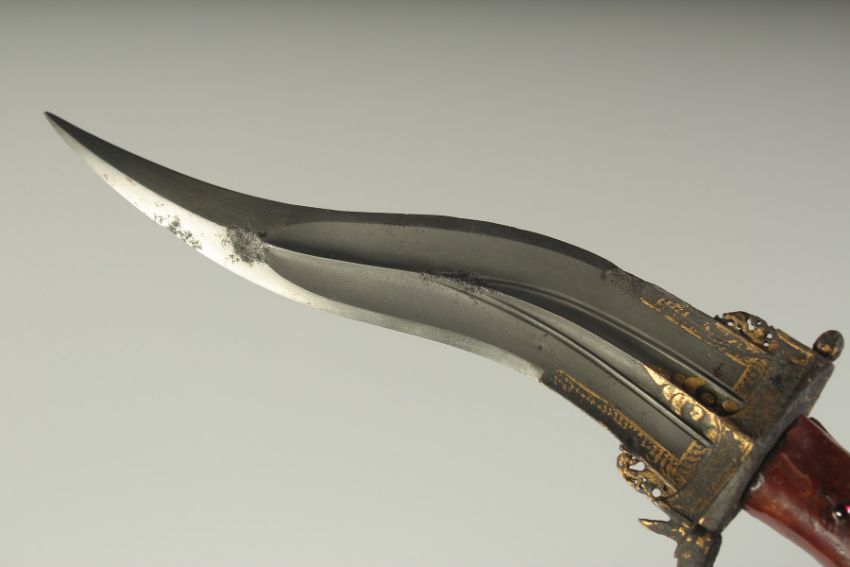 A VERY FINE 17TH CENTURY SOUTH INDIAN KHANJARLI DAGGER, with very fine gold inlaid blade and large red stone inlaid lacquered wood handle, the dagger with lion head details on the sides of the blade and top of the knuckle guard, 32cm long.