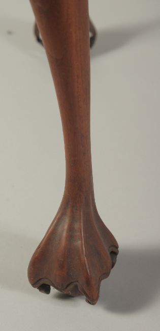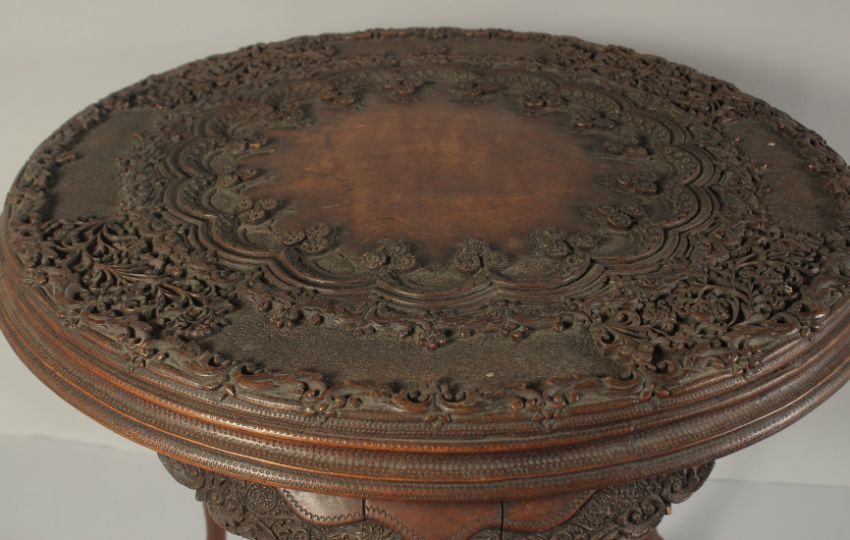 A FINE INDIAN CARVED WOOD TABLE, with intricately carved foliate border, standing on three legs terminating in claw feet, 56cm high, table top 60cm diameter.