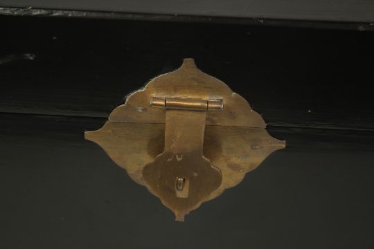 A LARGE BLACK LACQUER CASKET, with hinged lid and brass handles.