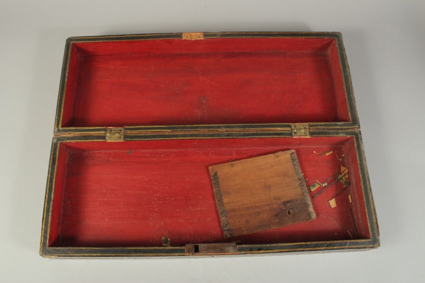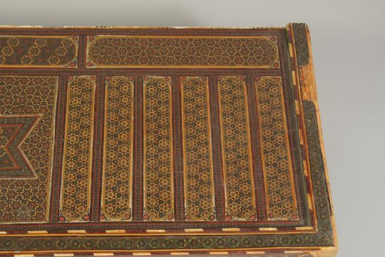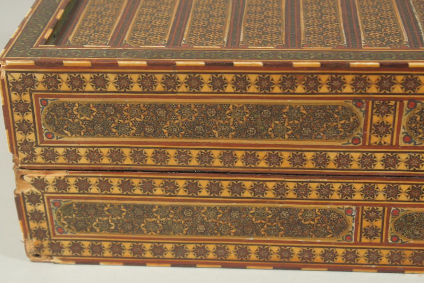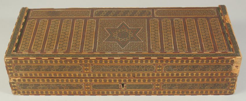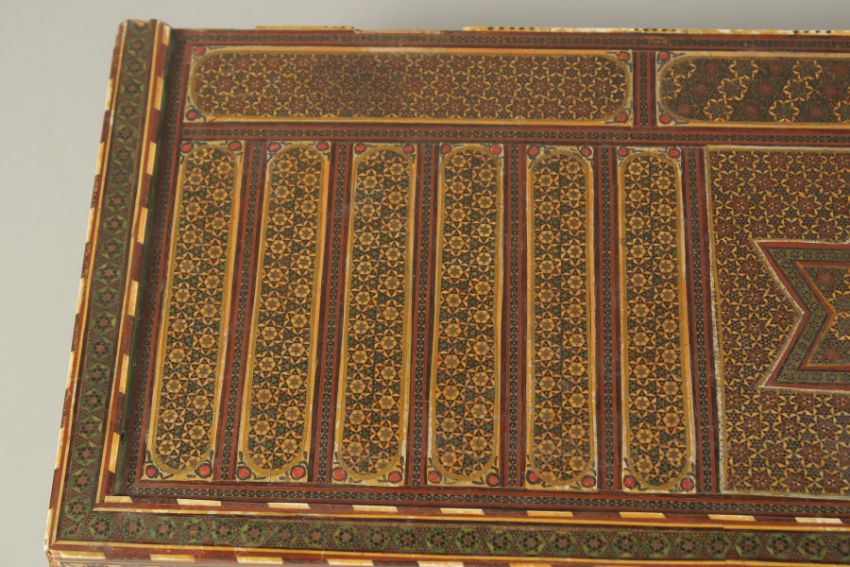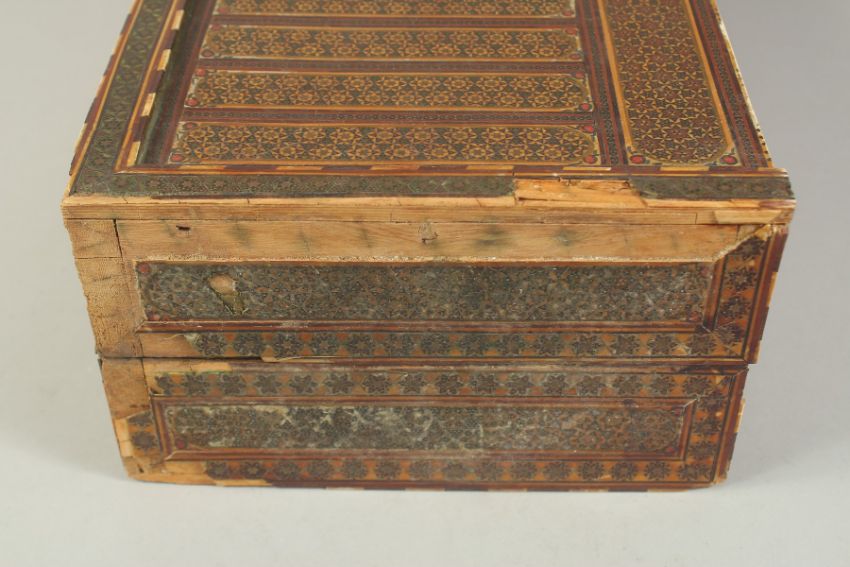 A PERSIAN QAJAR MICRO MOSAIC KHATAMKARI INLAID WOODEN BOX, (af), 32cm x 21cm.