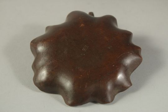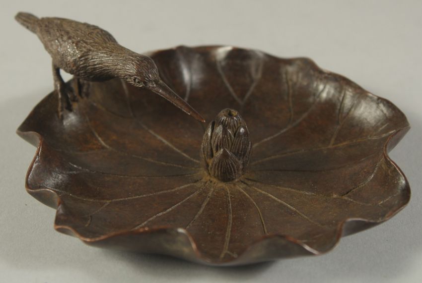 A BRONZE OKIMONO OF BIRD ON A LOTUS LEAF, 11.5cm wide.