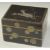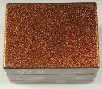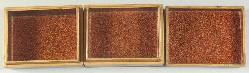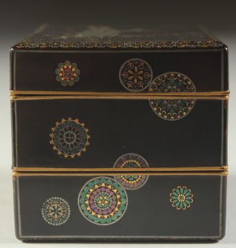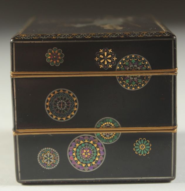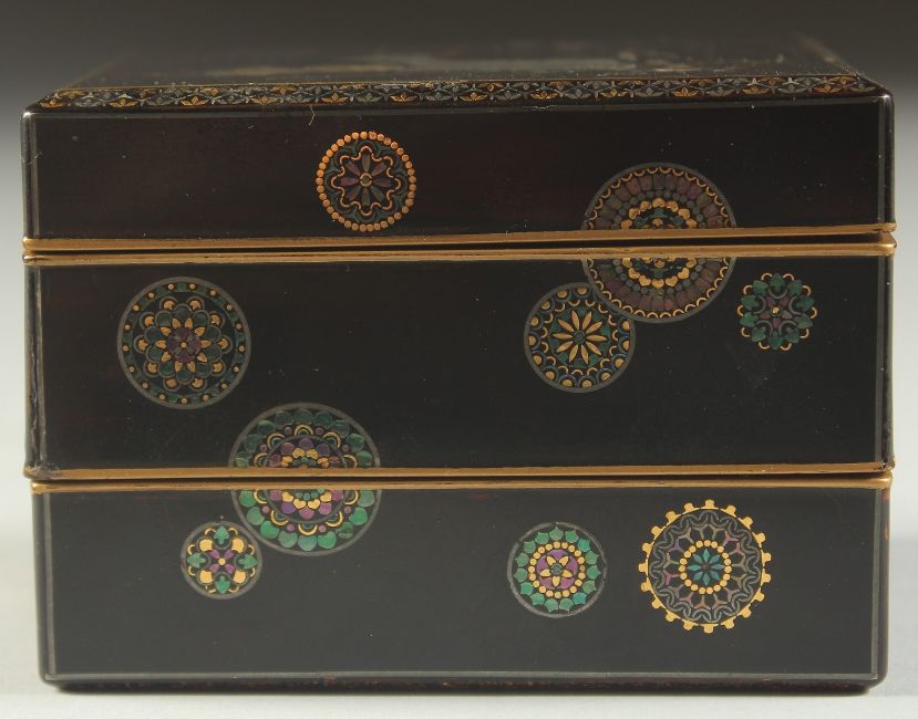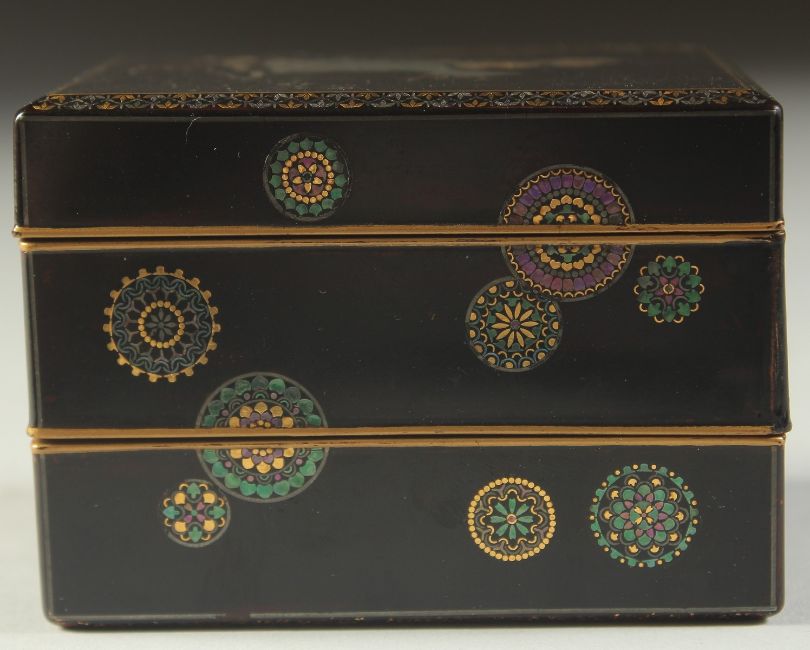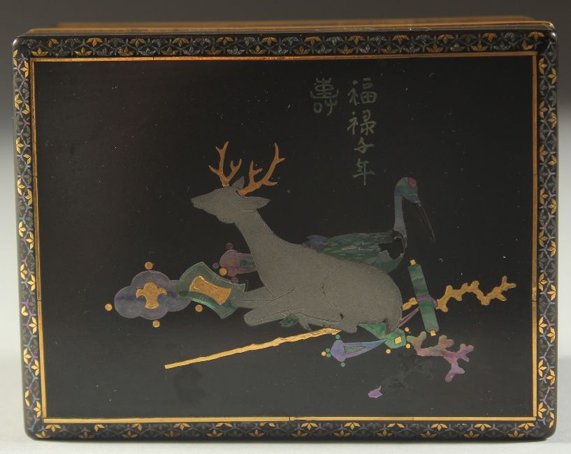 A FINE JAPANESE SIGNED THREE-TIER LACQUER BOX, decorated with a deer and crane; delicately inlaid with abalone and gold, 8cm x 6cm, 6cm high.