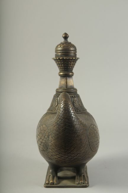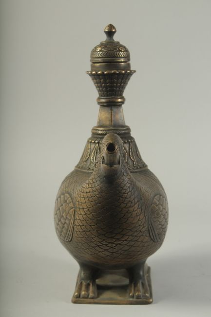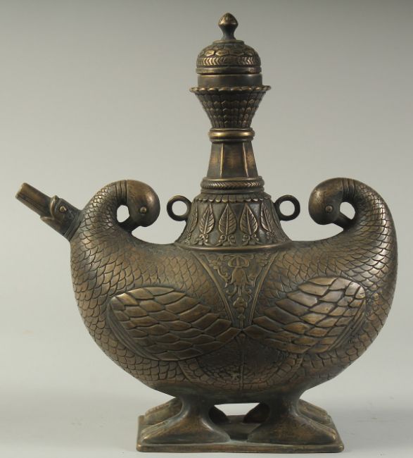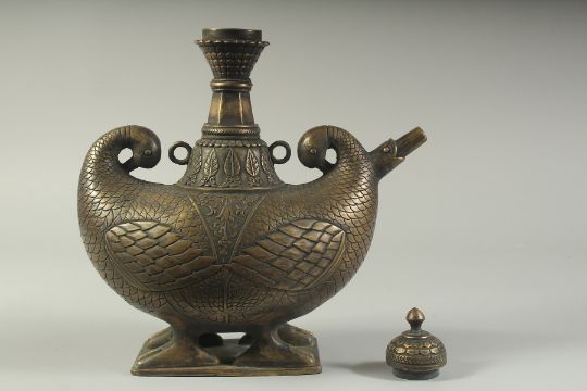 A FINE AND LARGE INDIAN BOAT SHAPED BRASS LIDDED EWER, with two duck shaped terminals to the side, 31cm wide, 36cm high.